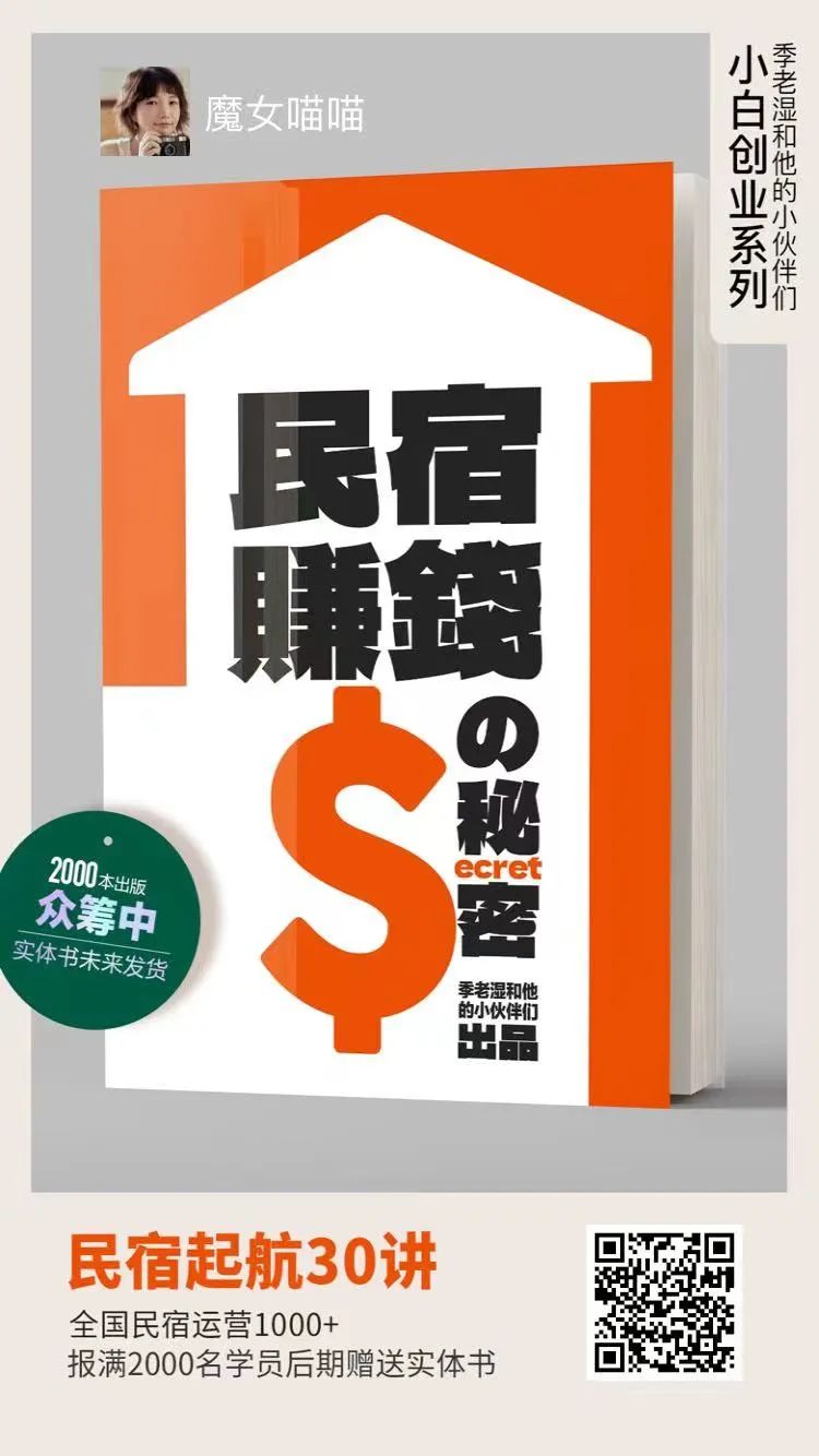 扫描上方图片二维码即可购买【前2000名购买者可获赠季老湿团队实体书《民宿赚钱的秘密》一本(出版洽谈中),先到先得】