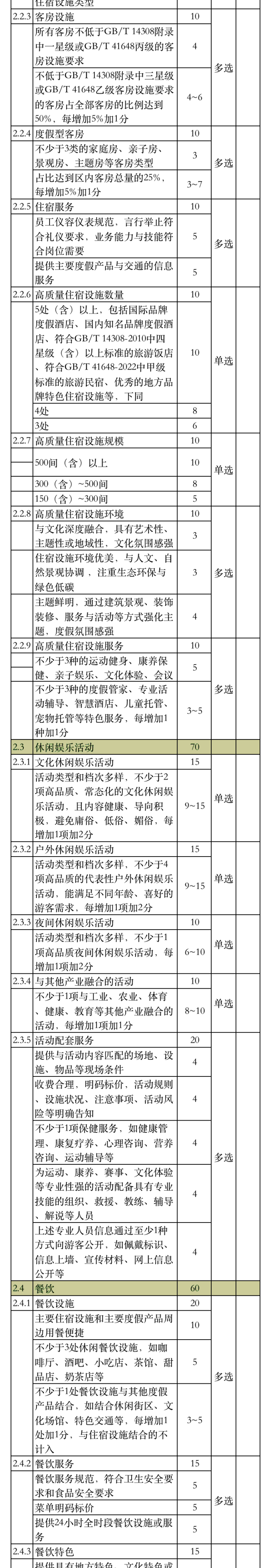 1、细则一包含两个部分,第一部分为必备条件,对《旅游度假区等级划分》(GB/T 26358-2022)的基本条件及相关量化指标进行评价;第二部分为基础评价,对资源环境与度假产品进行评价。