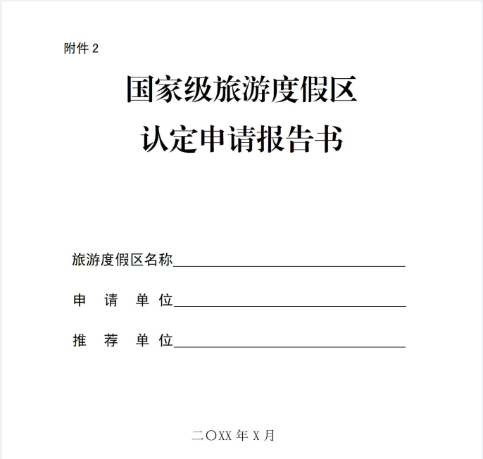 2、国家级旅游度假区认定申请报告书,包括旅游度假区基本信息(含名称、管理机构、空间范围、面积等)、发展概况、度假资源与环境、度假产品、度假公共服务、运营管理、市场结构与影响、生态文明与社会效益等内容;