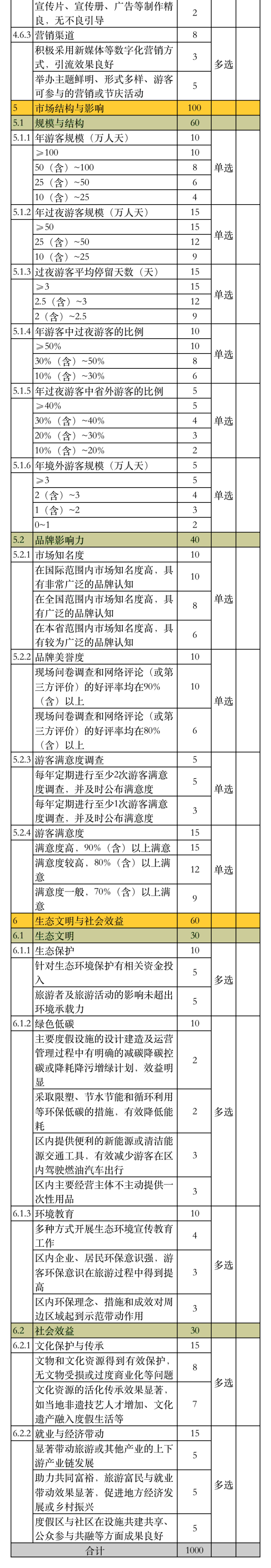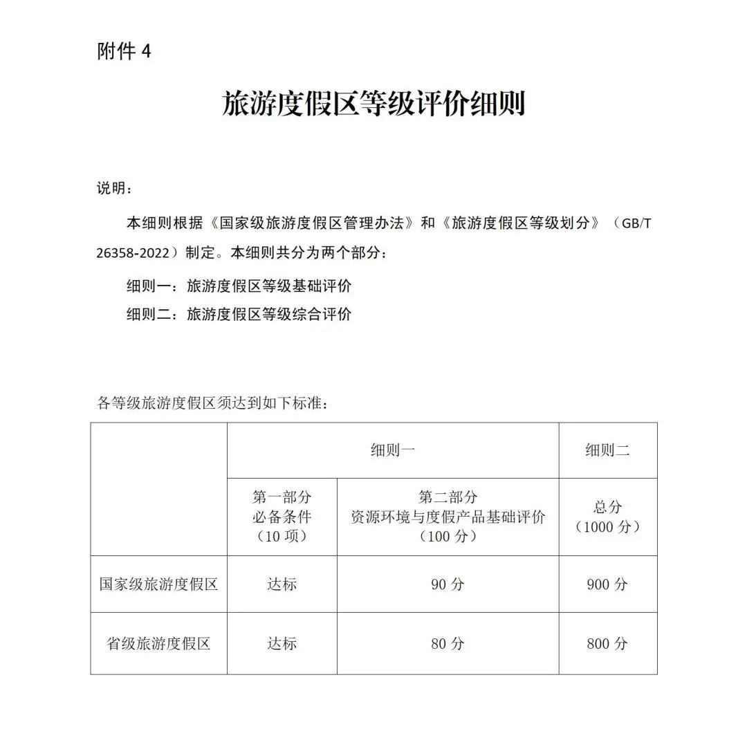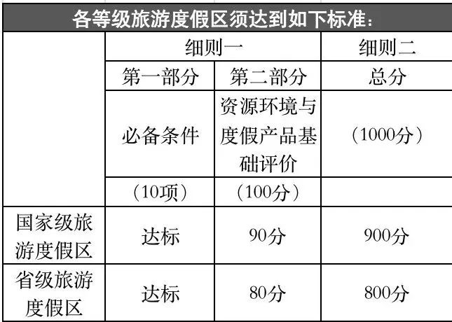 细则二满分为1000分,国家级旅游度假区须达到900分(含)以上,省级旅游度假区须达到800分(含)以上。