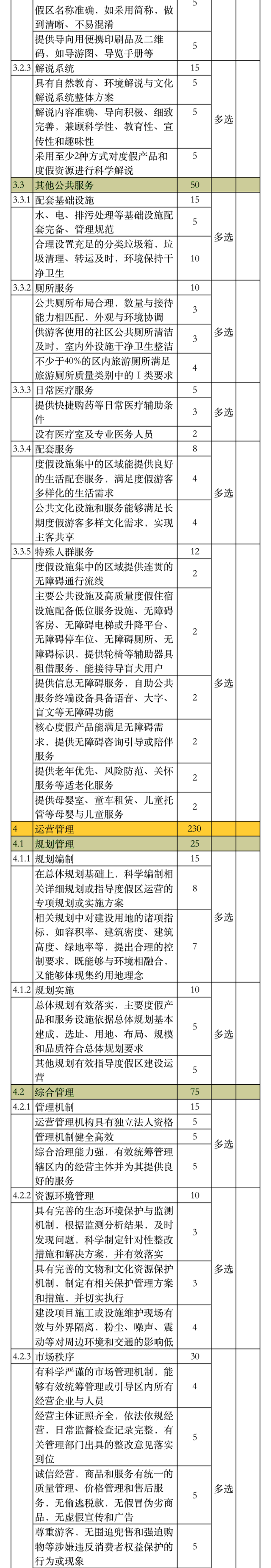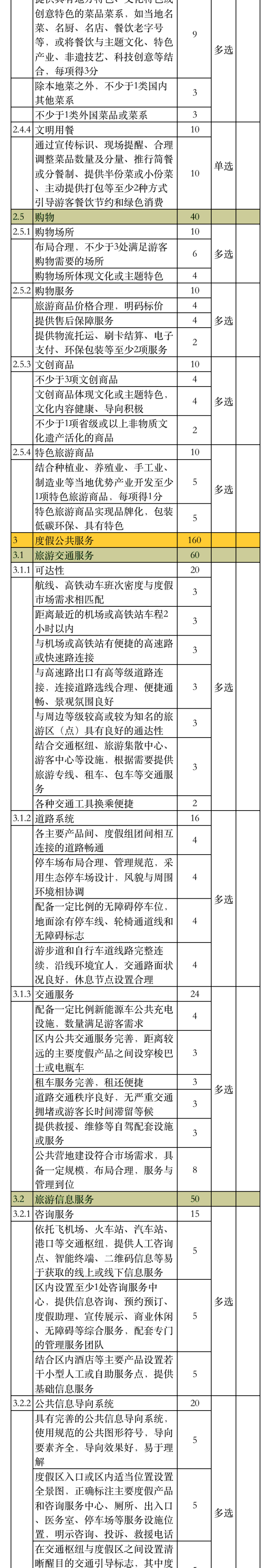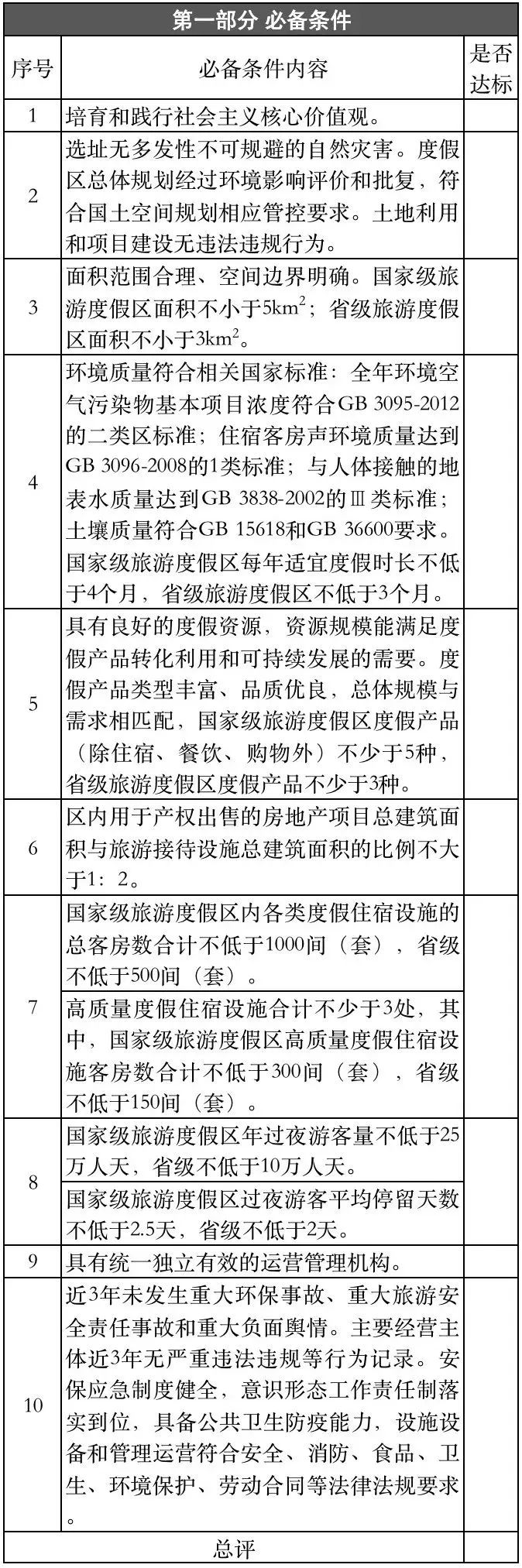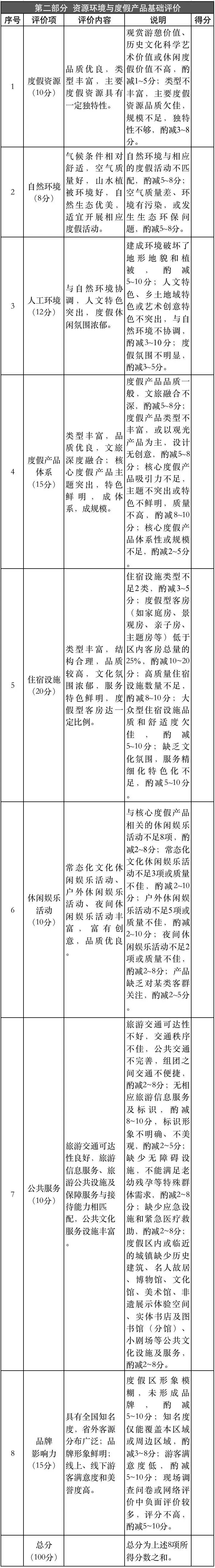 3、第二部分满分100分,评价项设置分值为基准分值,评价实行扣分制,直至0分。国家级旅游度假区须达到90分(含)以上,省级旅游度假区须达到80分(含)以上。