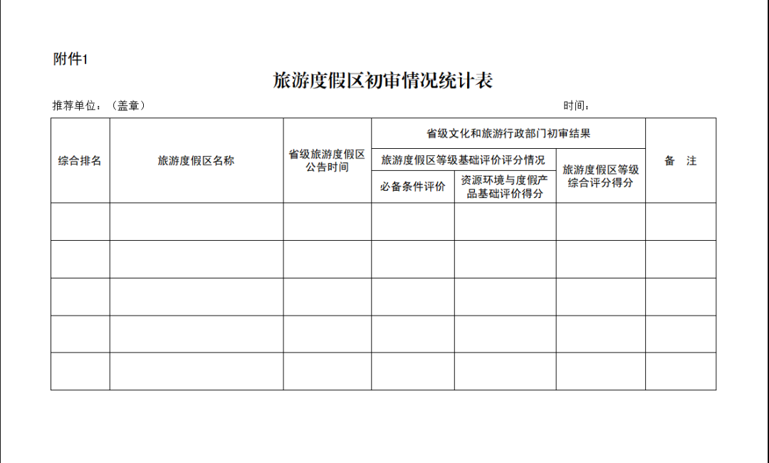 1、省级文化和旅游行政部门提交推荐文件及《旅游度假区初审情况统计表》;
