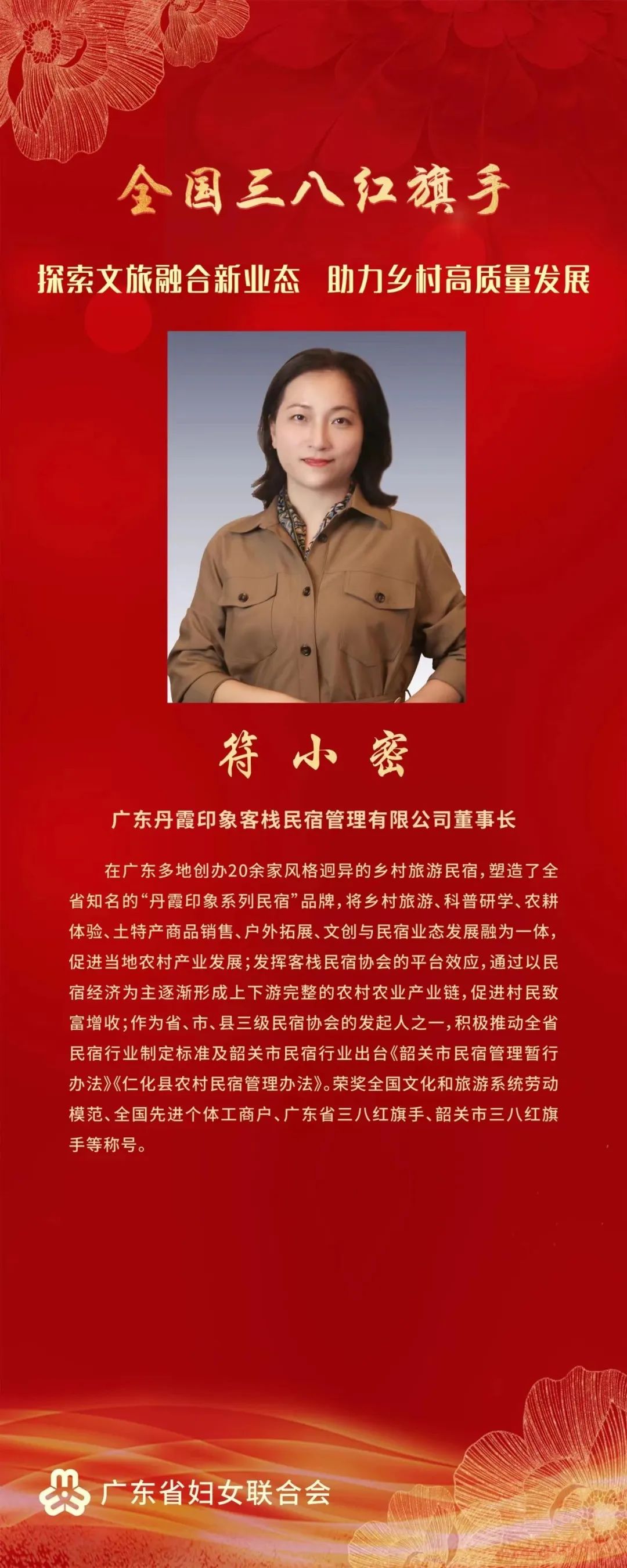 粤宿奖讯丨韶关丹霞印象民宿创始人符小密获评“全国三八红旗手”、河源仙塘山居创始人张俊慧获评“广东省三八红旗手”荣誉~