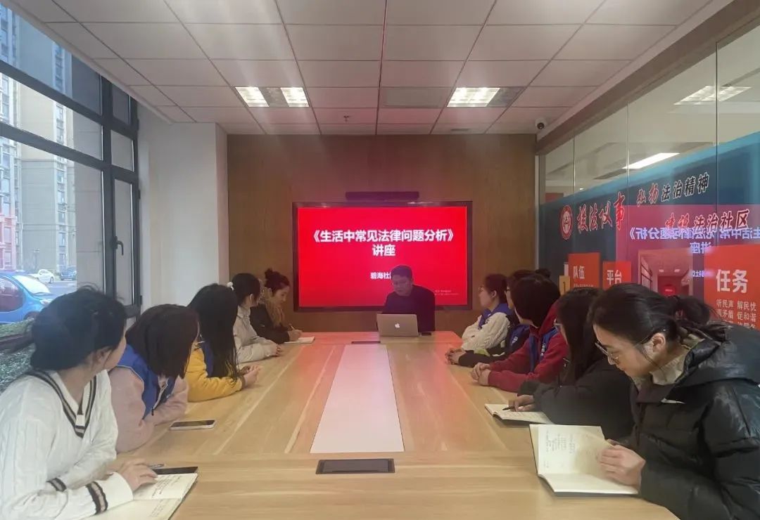 碧海社区将法治宣传教育融入日常网格工作,使普法教育向基层和群众延伸,让法治宣传更有人气、更接地气。社区专门邀请法律顾问崔律师为网格员讲解处理矛盾纠纷相关的法律法规。调处群众矛盾时,如何巧妙运用法律知识规避矛盾隐患尤为重要。“原来他家漏水的问题可以这样解决啊。”网格员杨俊感慨道。熟练掌握相关法律法规,不仅能提升网格员自身业务能力,也能协助她们在每日巡查走访时精准采集群众急难愁盼、化解矛盾纠纷,让普法内容更有针对性,调解效果也可以事半功倍。