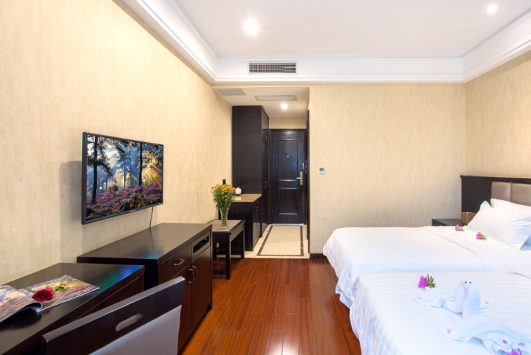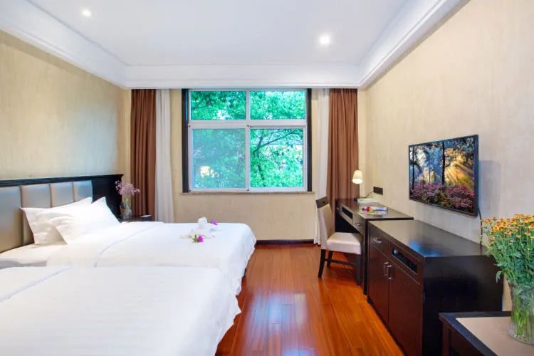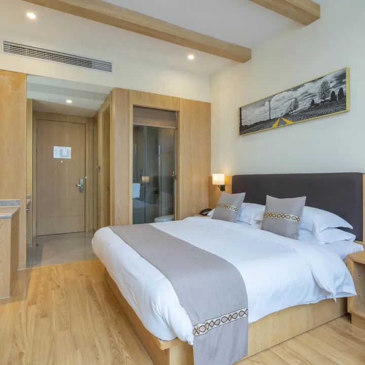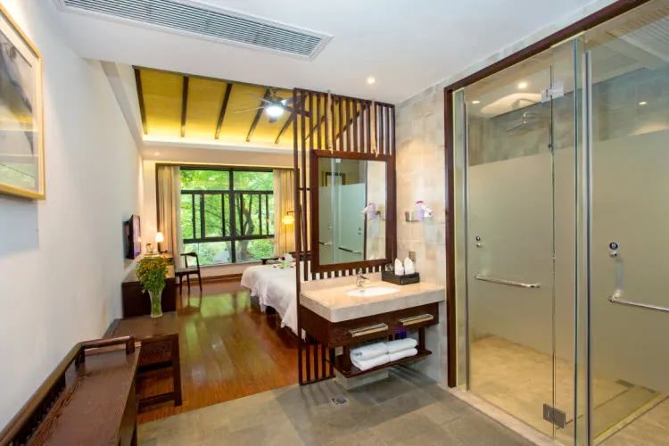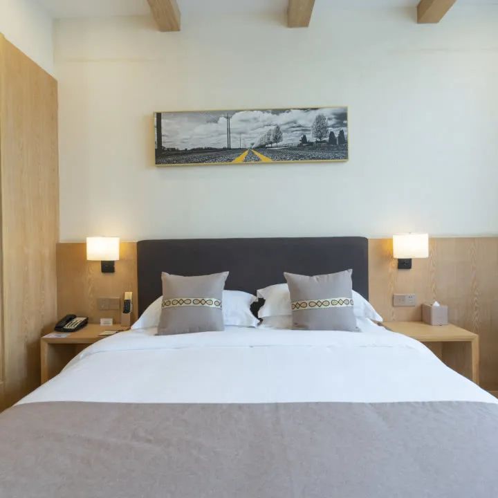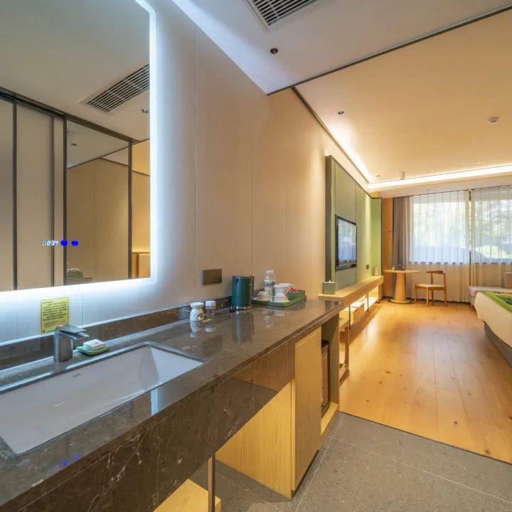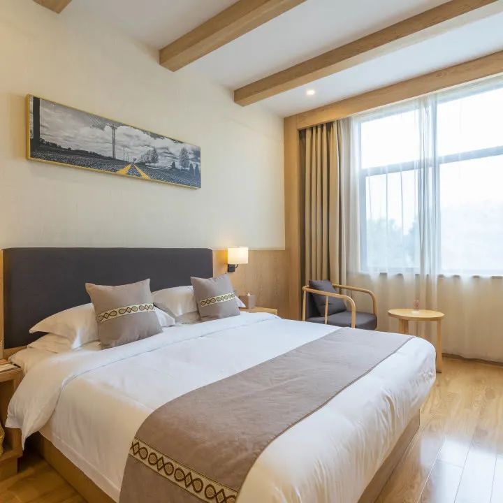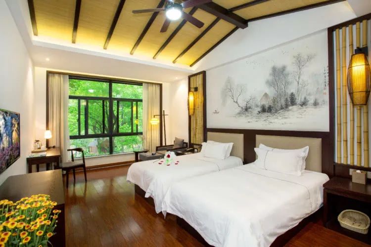 酒店共有185间客房,步入客房,古朴雅致的气息扑面而来。暖色调的家具与灯光,营造温馨浪漫之感。每间客房搭配壁挂的画作与具有安吉特色的竹雕装饰都在告诉你,你正处于一场有情调的旅行中。