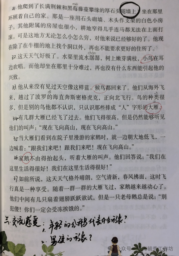 围墙上:小鸟、候鸟、大雁、家鹅、年轻的雄鹅