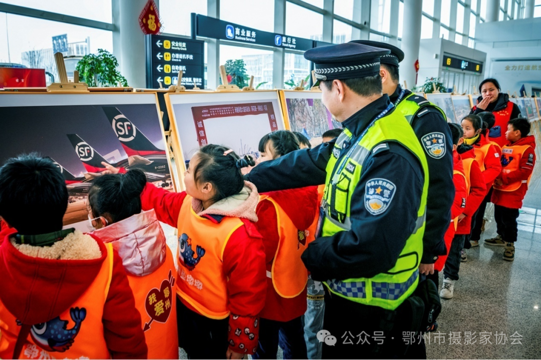 ▲ 在警察叔叔带领下观看摄影展欣赏国产大飞机。