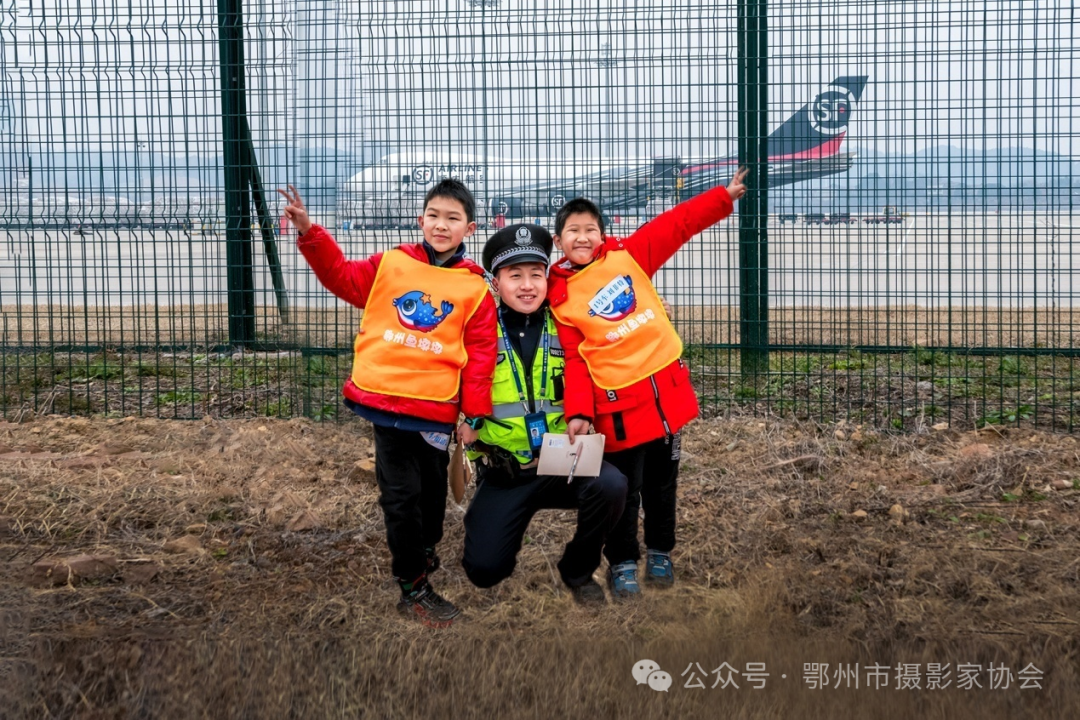 ▲ 在警察叔叔的臂弯下与大飞机合个影。