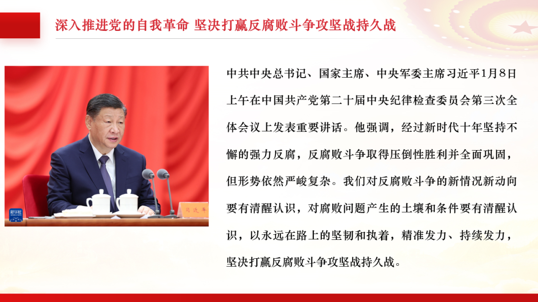 会议第一项议程,主持人蒋壤田带领支部成员共同学习习近平总书记在二十届中央纪委三次全会上发表的重要讲话。习近平总书记强调,经过新时代十年坚持不懈的强力反腐,反腐败斗争取得压倒性胜利并全面巩固,但形势依然严峻复杂。我们对反腐败斗争的新情况新动向要有清醒认识,对腐败问题产生的土壤和条件要有清醒认识,以永远在路上的坚韧和执着,精准发力、持续发力,坚决打赢反腐败斗争攻坚战持久战。