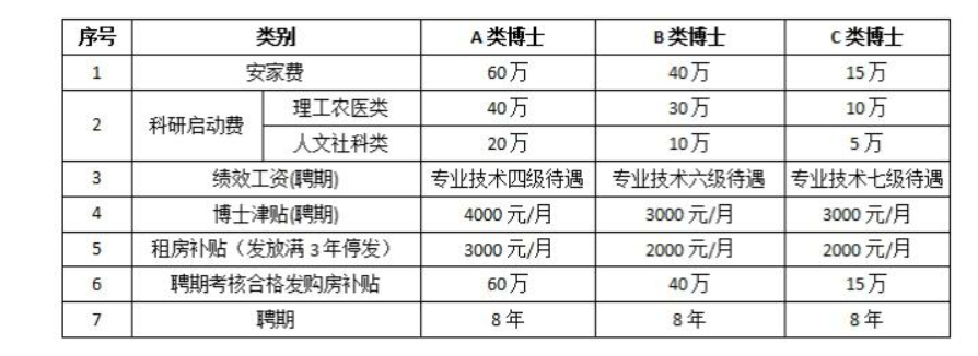 引进博士须签订聘用服务期协议,服务期不少于8年,按照聘用服务期协议享受下表待遇。