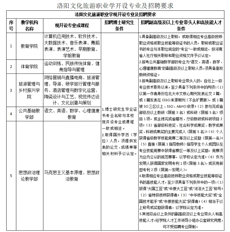 洛阳文化旅游职业学院开设专业及招聘要求