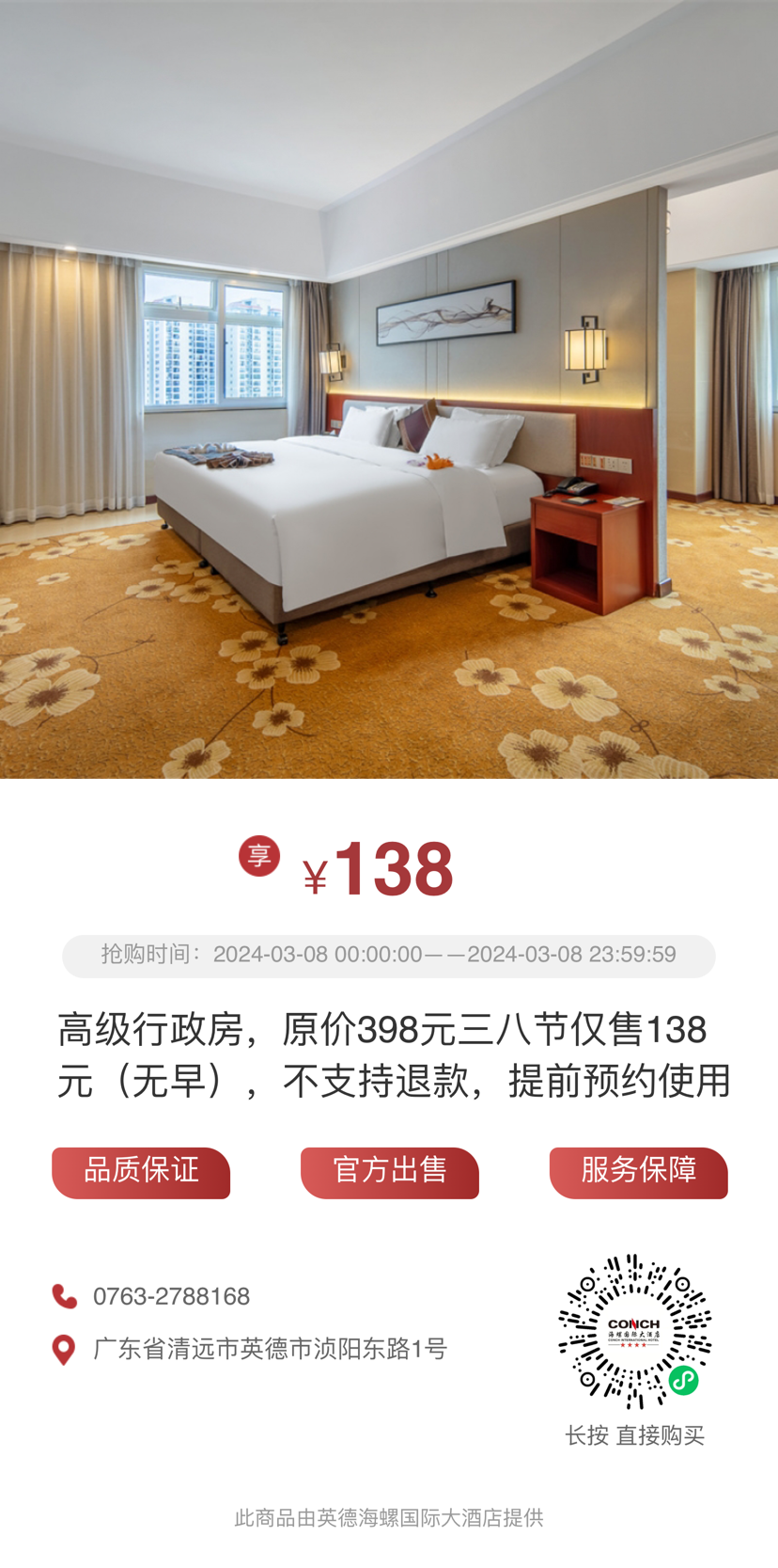 3月8日启售,购买成功后微信小程序订房使用该券立减38元,商务房最低低至142元起(3月全月可用);