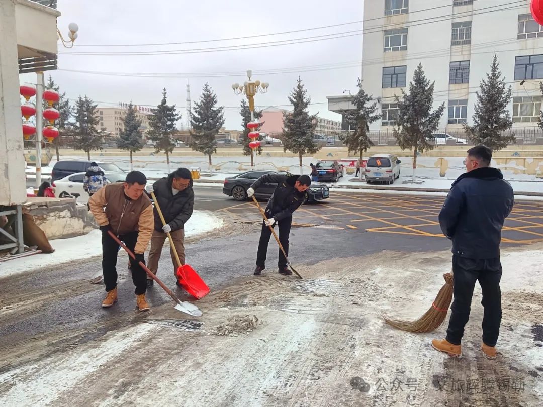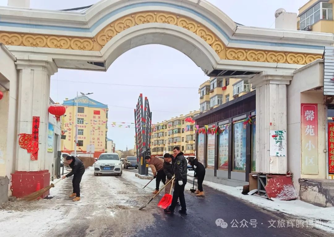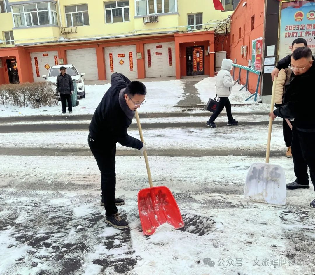 恰逢昨夜一场春雪,皑皑白雪笼罩整座小镇,为了方便单位包联小区居民出行,17名党员志愿者挥舞扫帚、铁锹,细致地清理道路积雪,为小区居民清理出一条条“平安路”。