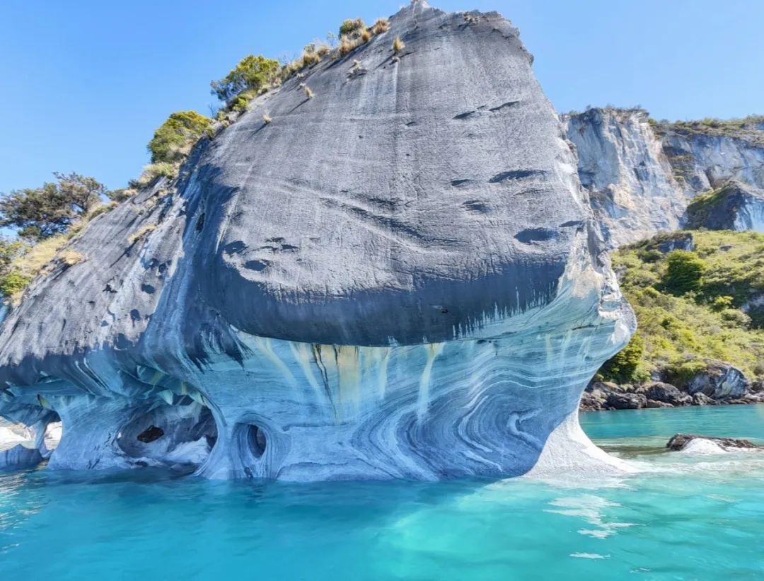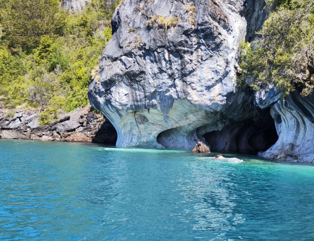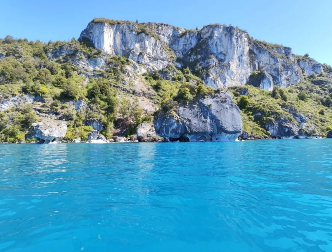 紧接着,我们的游船靠近了大理石洞穴。洞穴深嵌在高高的大理石山崖与湖水相接的地带,山崖上遍布苍翠的植被,而湖水却蓝的如同……化学实验室里的硫酸铜溶液? 哈哈,这个比喻可能不太恰当,但是,这种美景真给人一种很不真实,无以言表的感觉!据说,这片山崖是几只安第斯秃鹫的老巢,只可惜,我们当天并没能一睹它们的雄姿。
