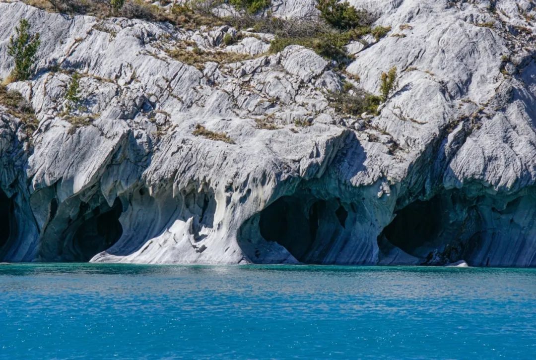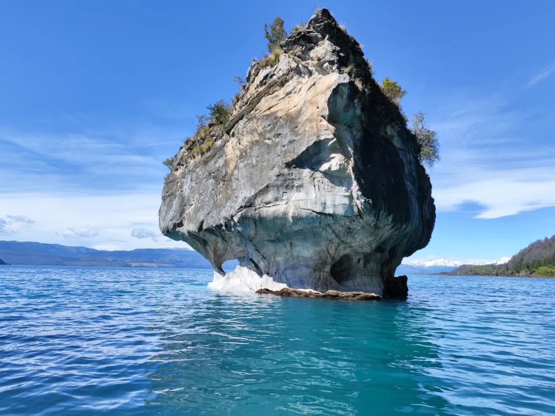 湖水在接近大理石洞穴的湖畔变得更加柔和明亮,在阳光的照耀下绽放出热带海洋的那般湛蓝,配上山坡郁郁葱葱的植物,仿佛来到了东南亚某海滨度假村……若不是回头看见湖对岸那一排高大的雪山,我怎会感觉得到,自己就在巴塔哥尼亚的腹地呢?包罗万象,变幻莫测,这就是巴塔哥尼亚,这片异世般土地最迷人的地方!