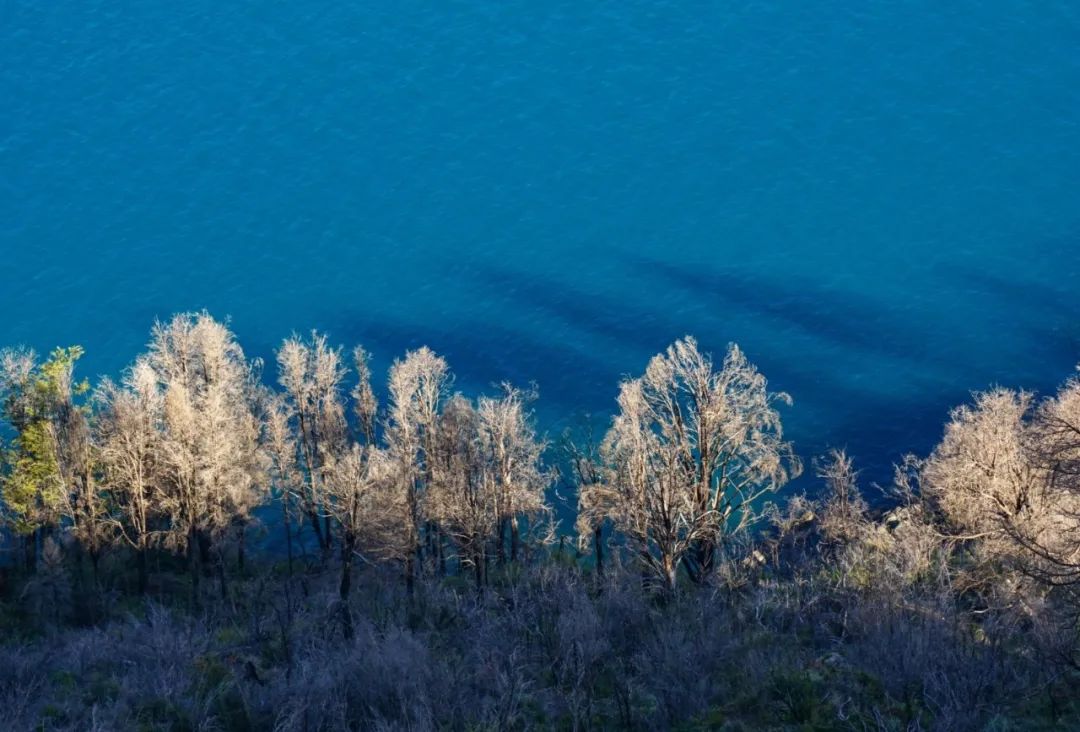 此时,天色已开始变晚,日光柔和了起来,洒在湖畔的枯木上,映衬着那始终蓝得梦幻的湖水,美轮美奂!