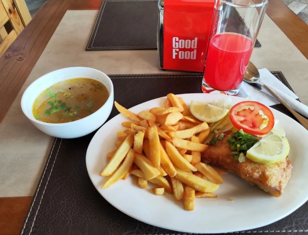 无论如何,先晒一张当天的午饭——智利版炸鱼薯条与樱桃汁,总价11000智利比索,约合90人民币。我还特意询问这鳟鱼是不是从卡雷拉将军湖里面捞出来的。老板很诚实,说这是旁边的小河里捞的……好吧!这不影响这道菜的美味!