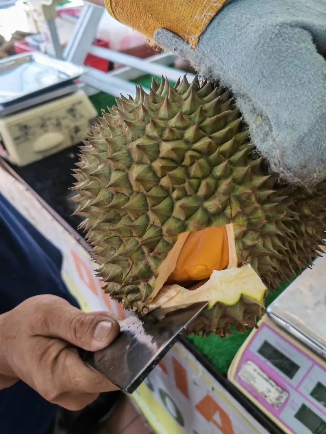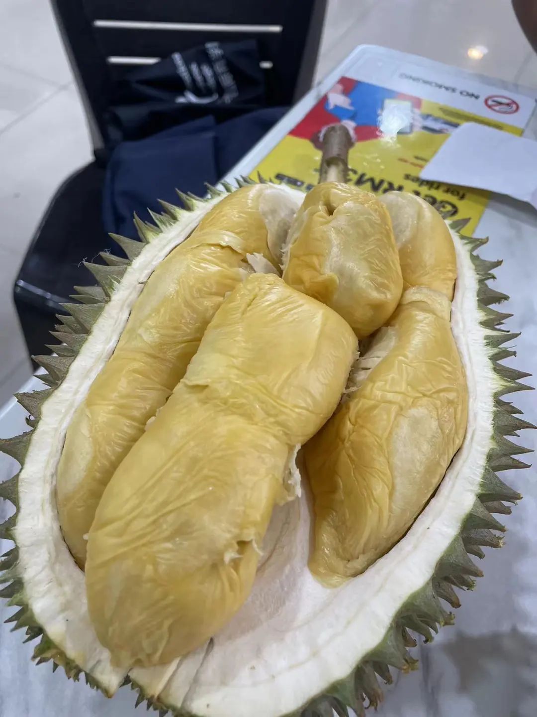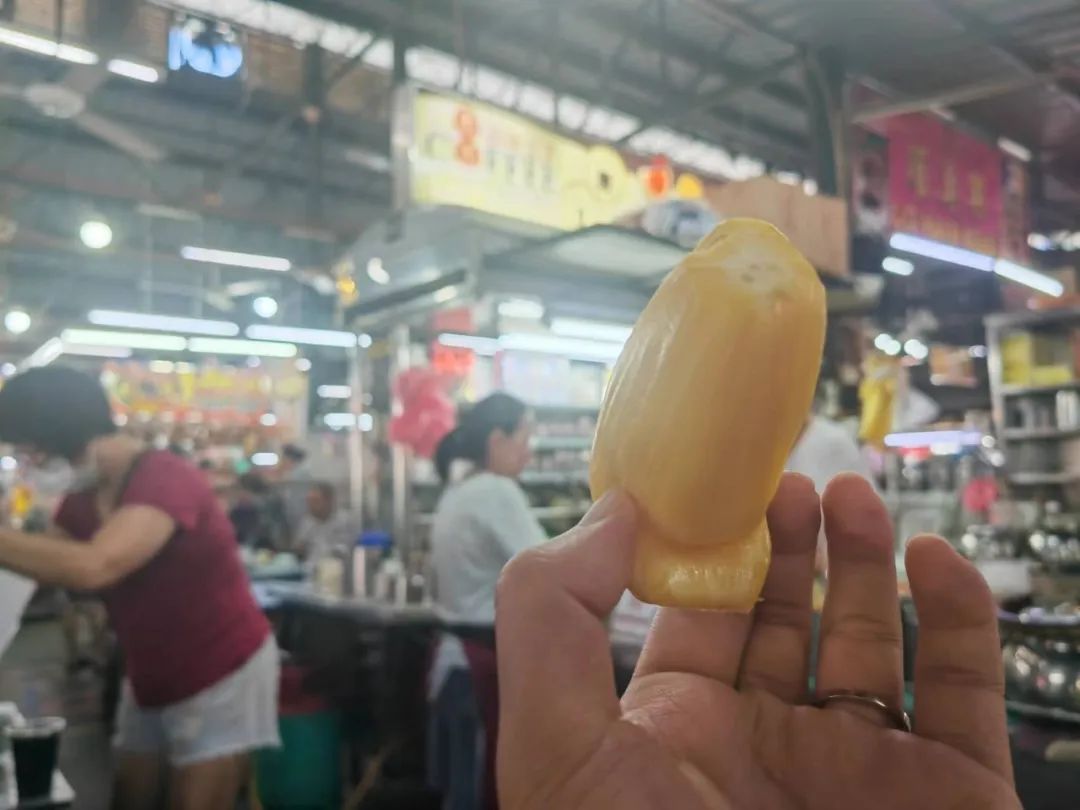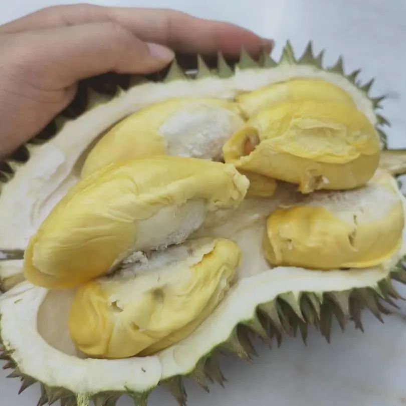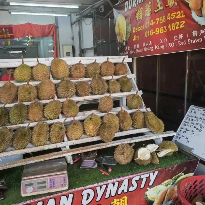 因为怕上火,约定每天只吃一颗榴莲,有一天饭前甜点直接炫了两颗。卸货的车刚刚到,果断让老板帮忙选了一颗黑刺尝尝鲜,费用是所有榴莲中最贵的,一颗好像是180RM。后边不够爽,觉得应该有个品种来对比一下,又选了一颗性价比更高的葫芦。黑刺确实浓郁,果肉颜色会更深,周围桌的人都投来了羡慕的眼光哈哈。
