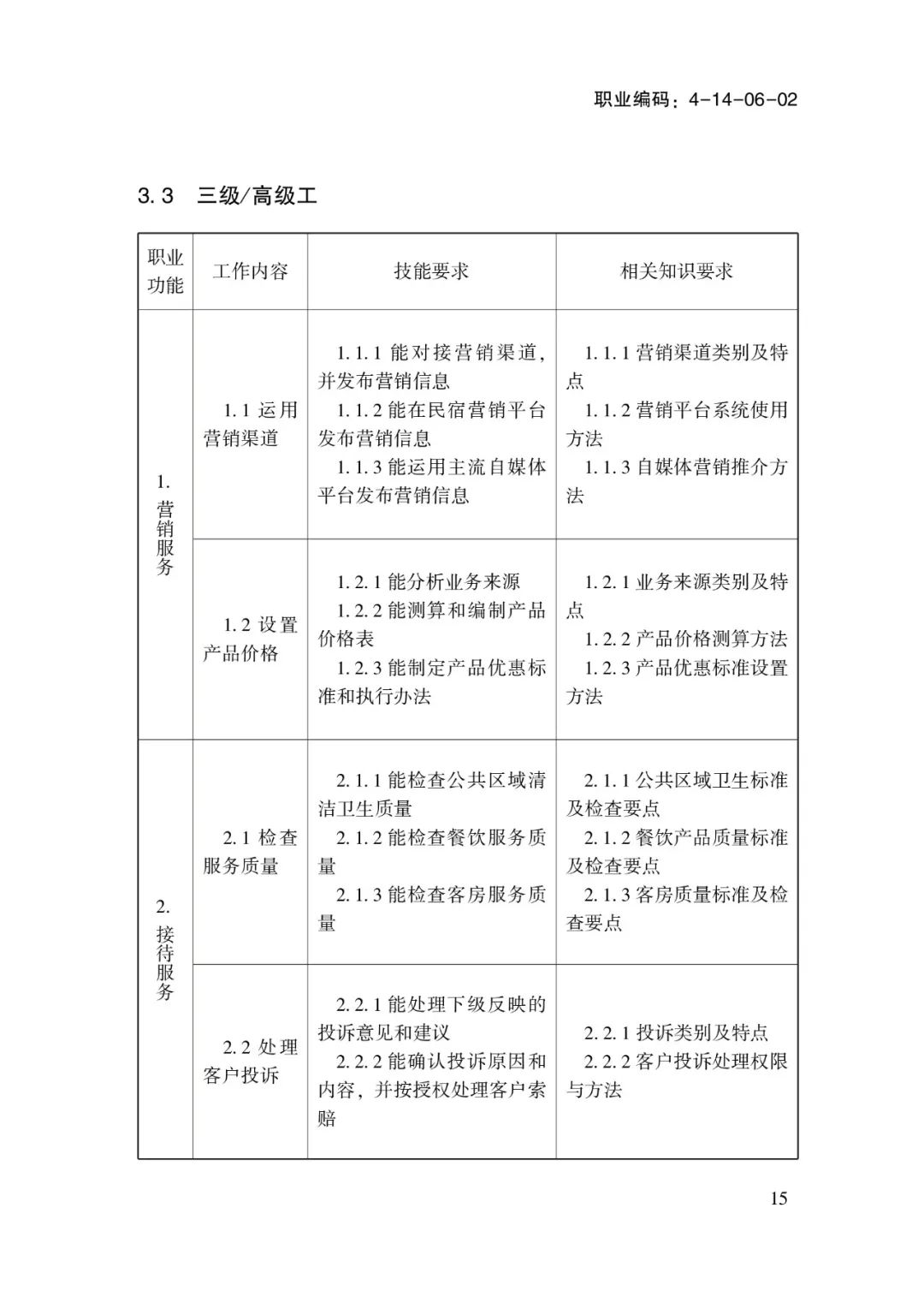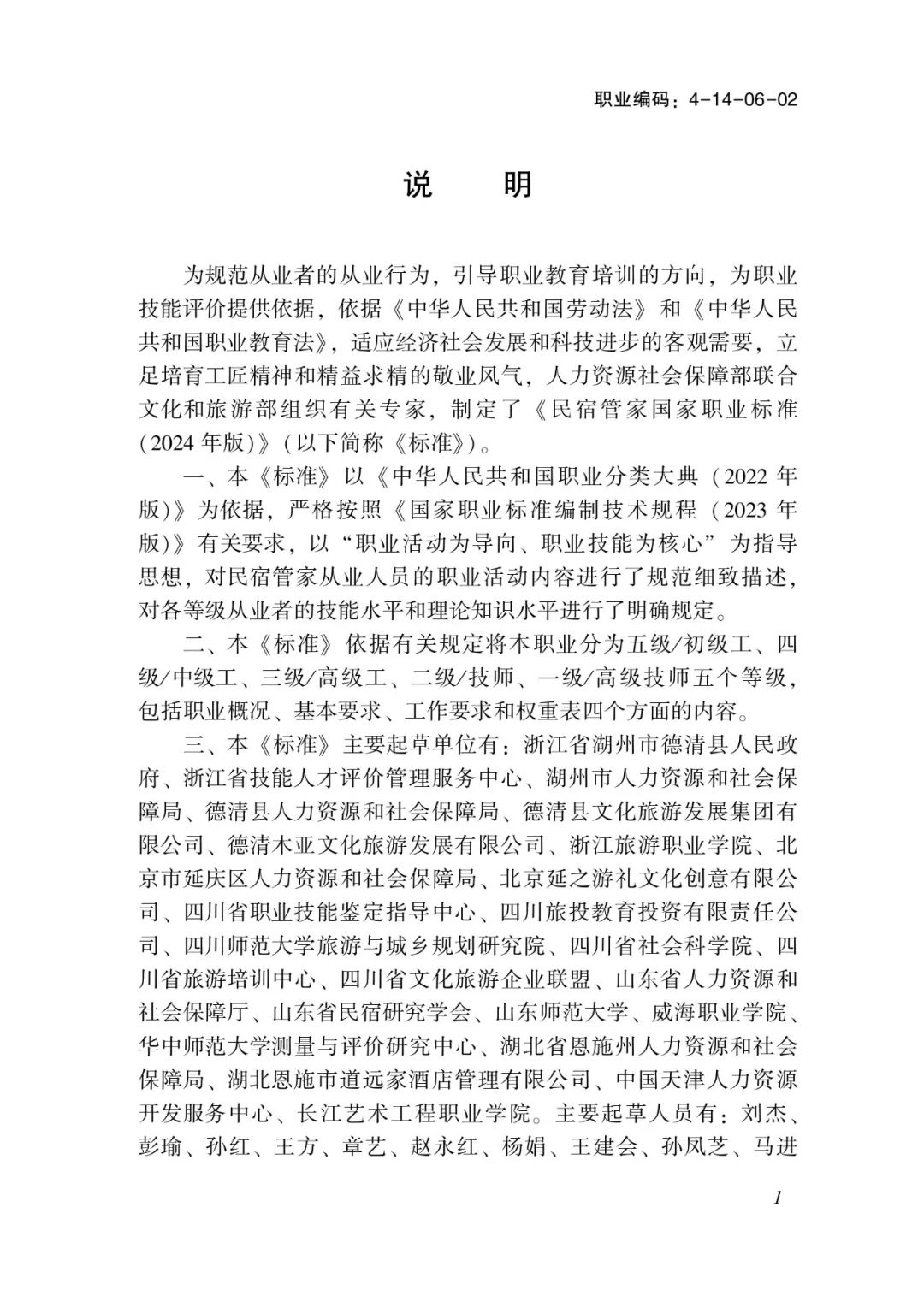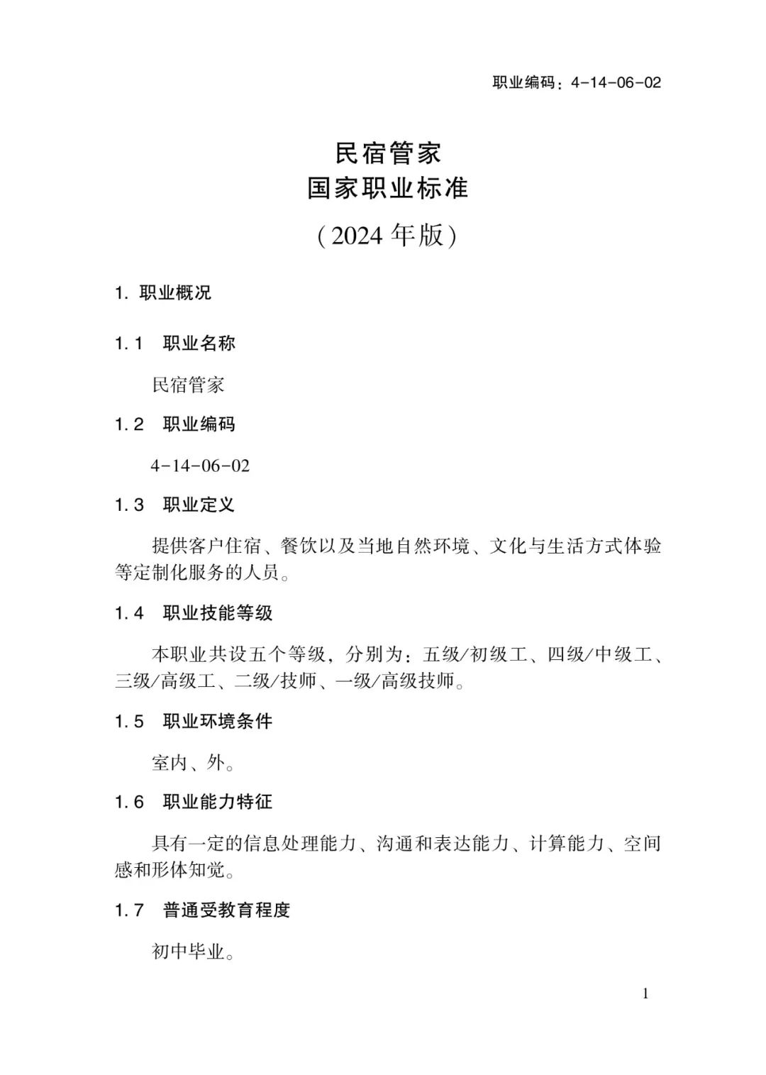 民宿资讯丨《民宿管家国家职业标准(2024年版)》发布:民宿管家共设五个职业技能等级,最高级别为:一级/高级技师