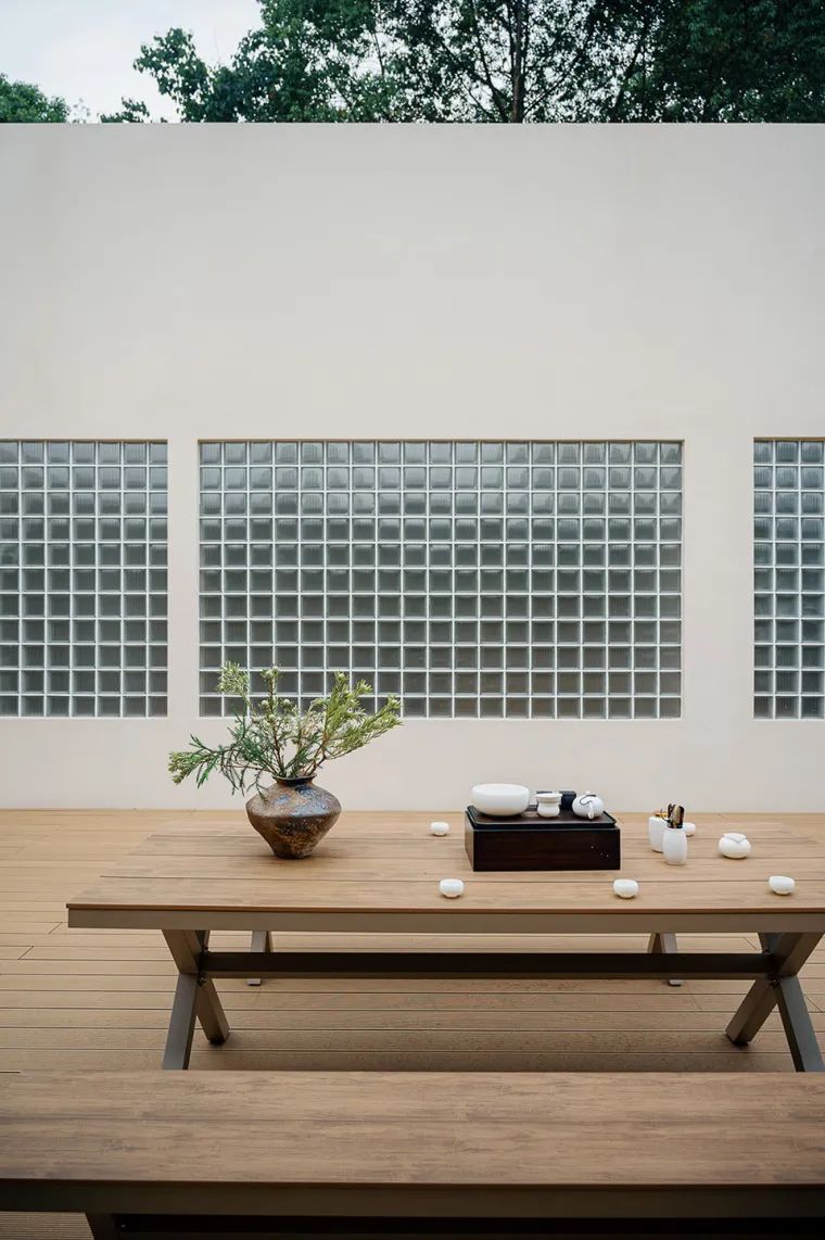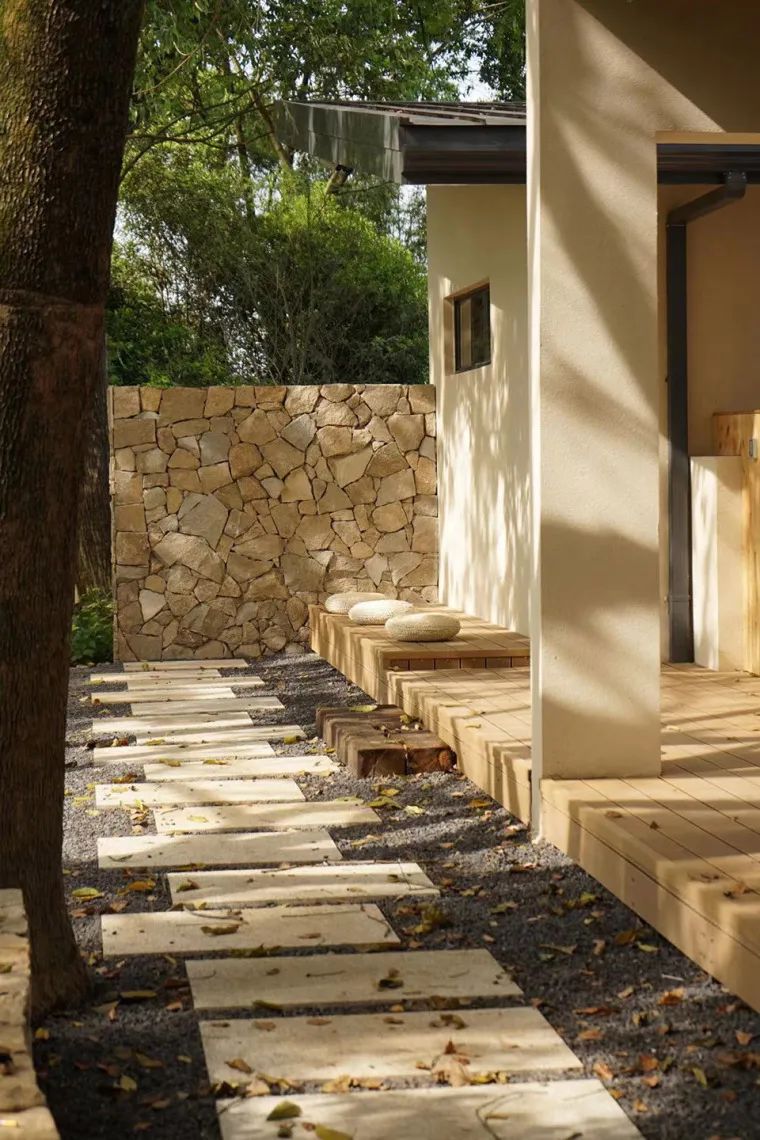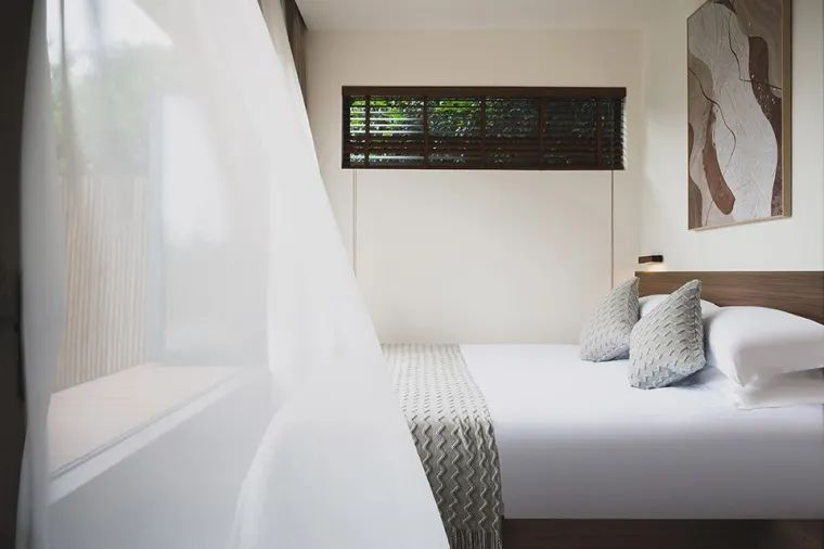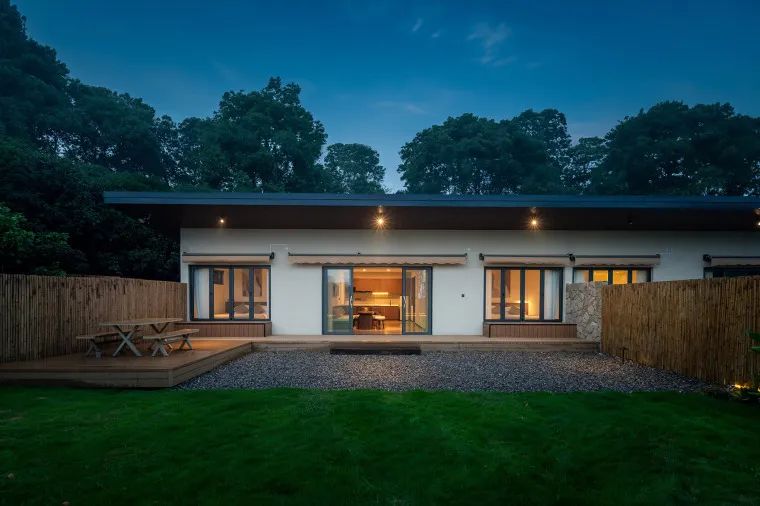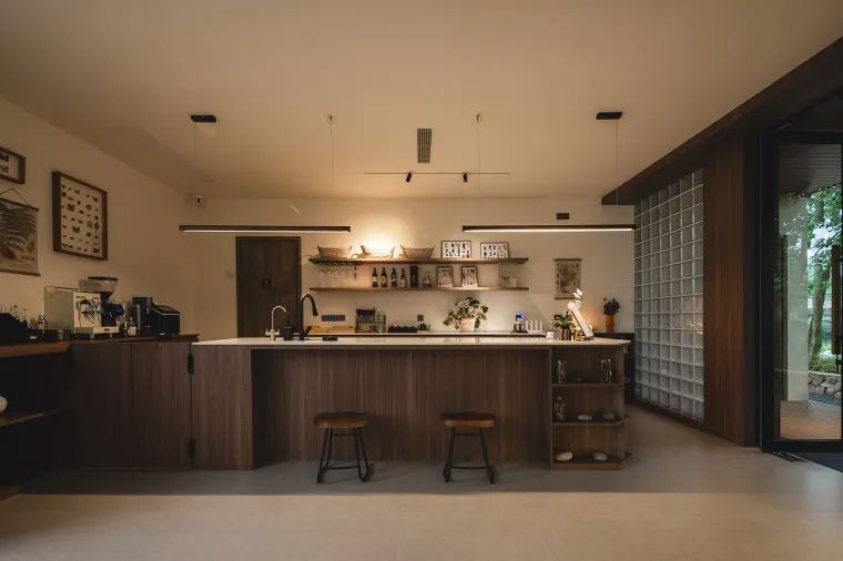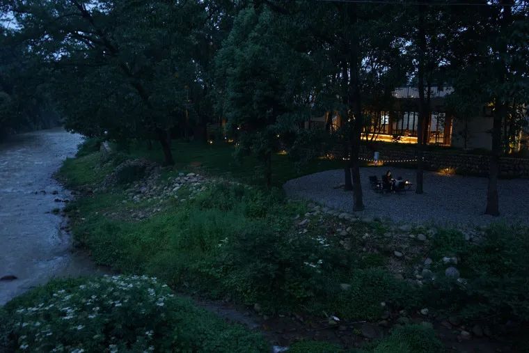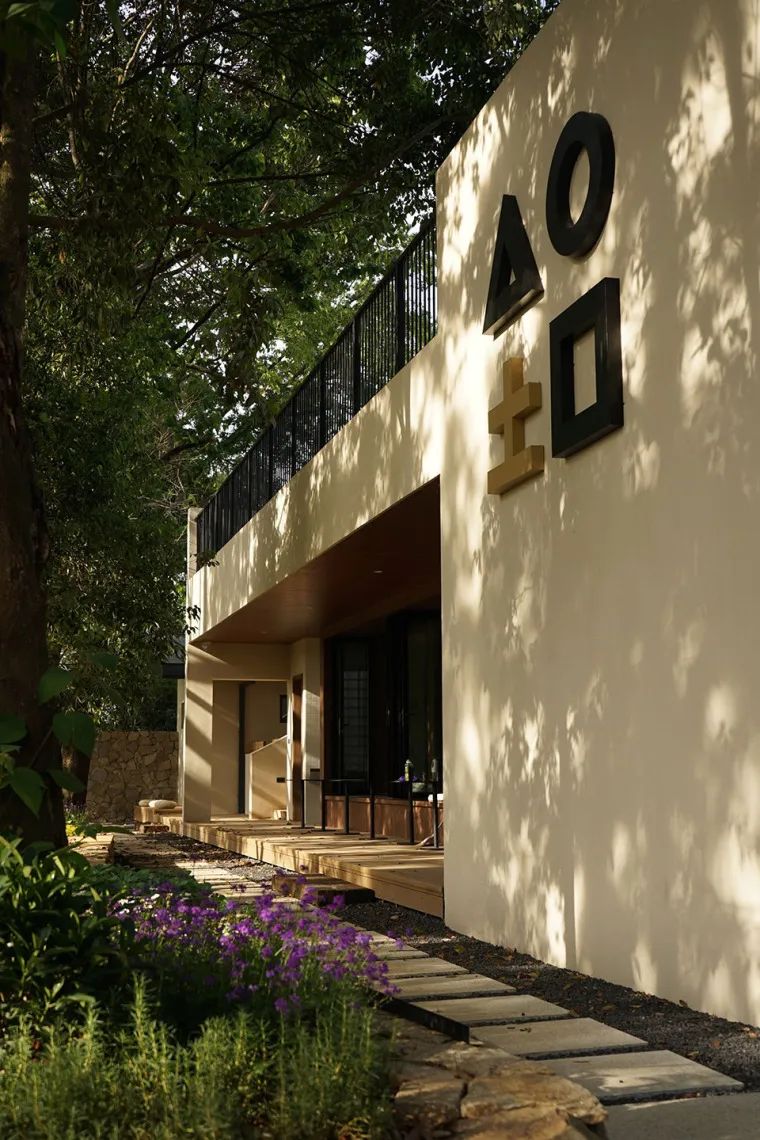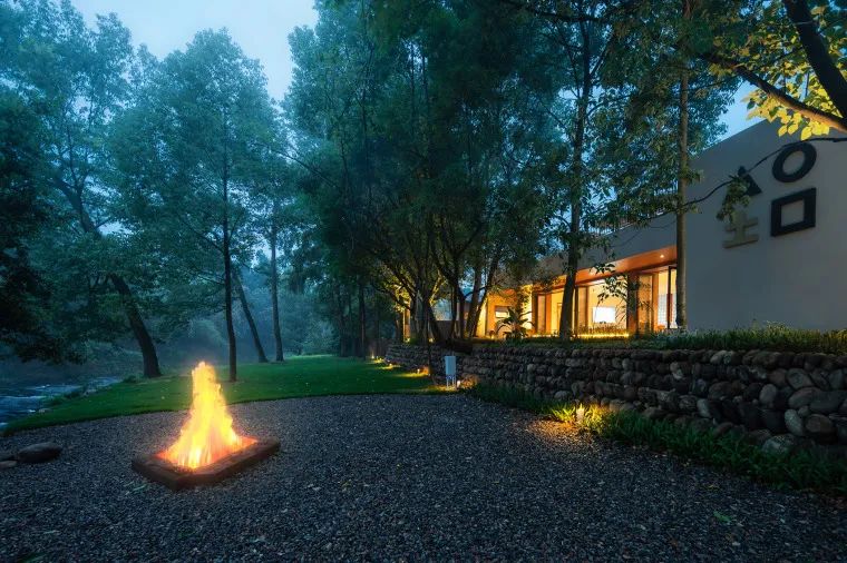 我们对建筑的探索,首先经过一个大面留白的LOGO墙体,自抵达建筑入口之后,随即可见吧台、餐厅、水吧和外摆等构成的公共区域。走廊尽头的楼梯可到访二楼平台,平台高度正处在近旁大树的树冠位置,周围葱郁绿意围绕,树影婆娑,微风习习,还可听闻不远处的溪水流声;自然与建筑共同消融于此刻的恬静与闲适,“微风清幽幌,余日照青林。”建筑前方亲水场地作为多功能户外营地区域,可以举行户外野餐烧烤,以及研学活动,或者在溪水旁边举行草坪婚礼、生日派对等小型集会。靠近自然,临水澄心,静而生道,为久居都市人群提供一方遁世幽所。中庭是一个由四面外墙围合而成见天见地的半户外空间,也连接起了整个建筑的公共区域和客房区域。在承担起公私区域的过渡连通功能之外,中庭同样也是一个小型的活动场所,在这里品茗下棋,伴清风小憩,自在怡然。装饰朴素直白,富于淡雅天趣的审美意境。客房区域设置为三个独立共享小院,分别是悦木、乐土、喜水,均配有客餐厅、厨房、双卧室、私属院落。