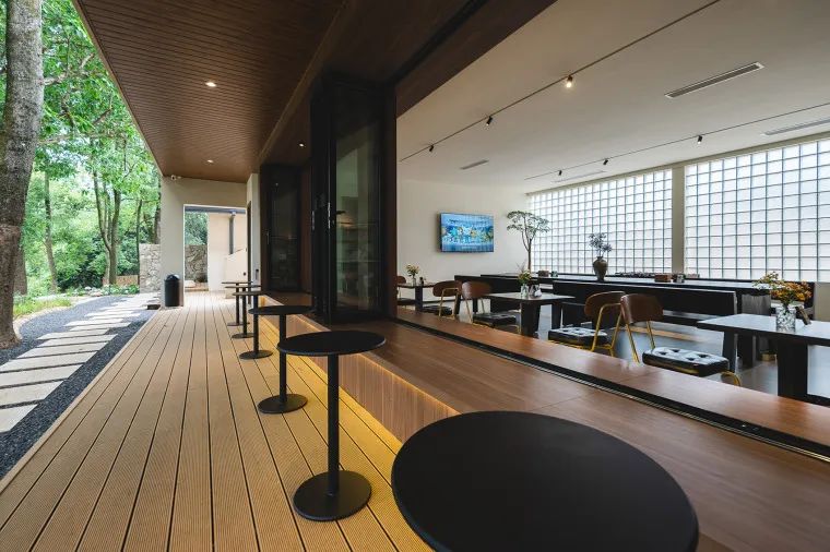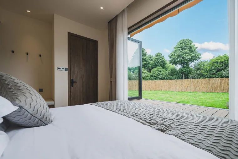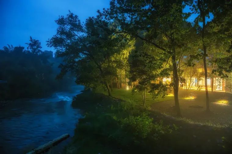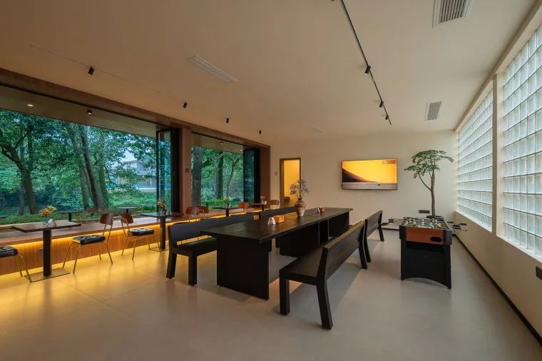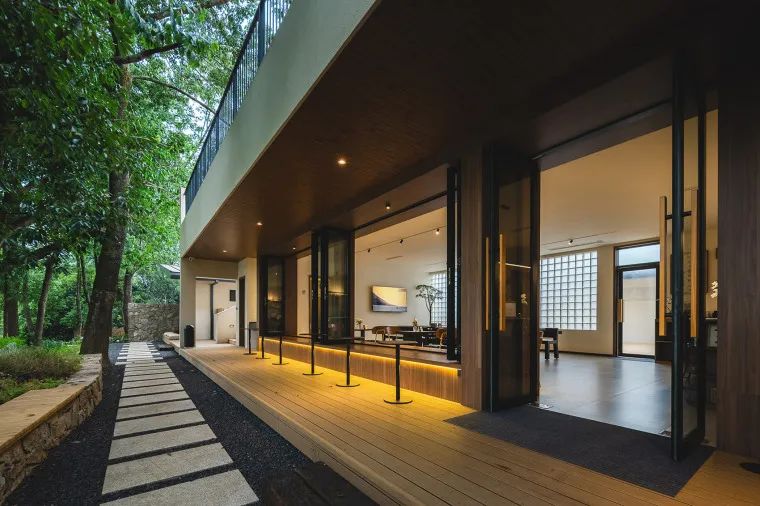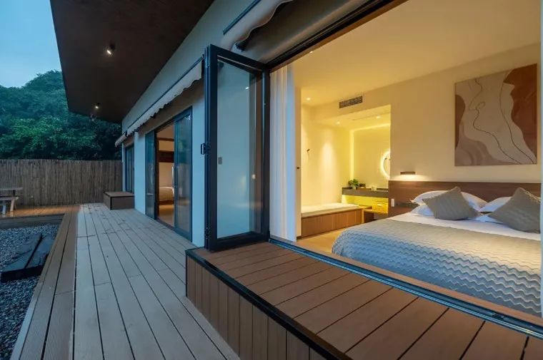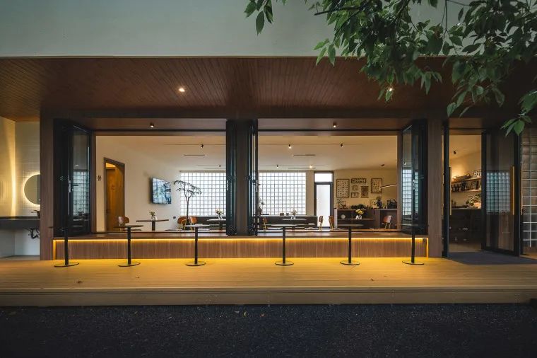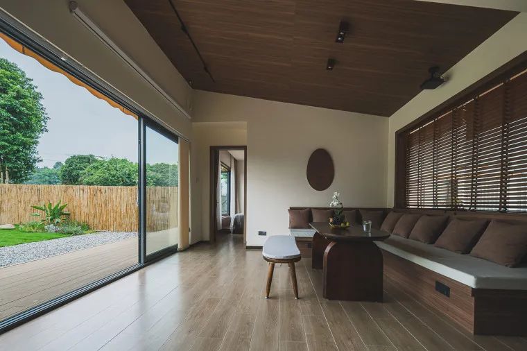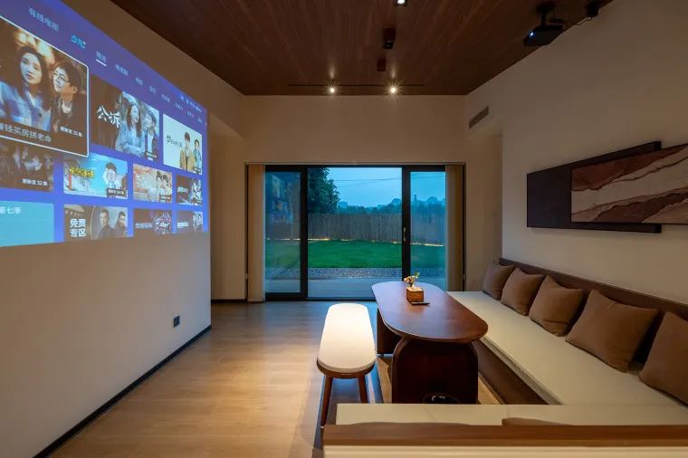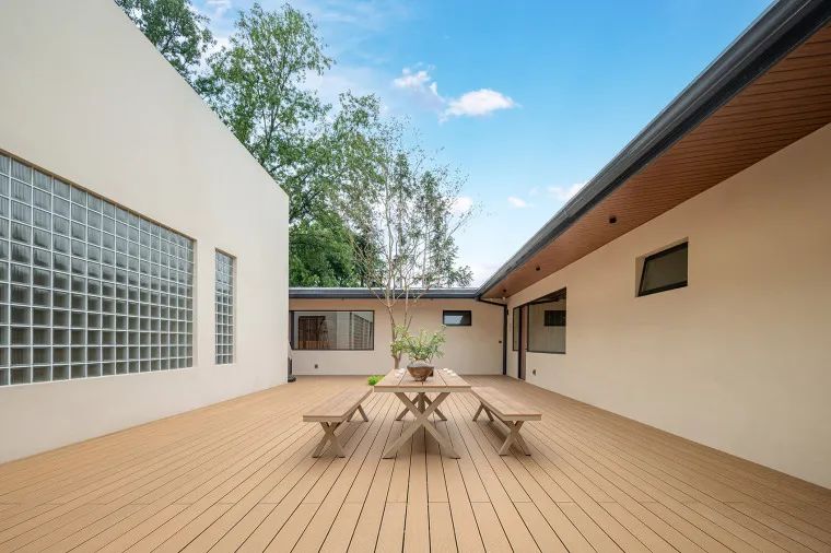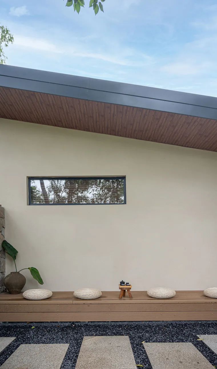 我们对建筑的探索,首先经过一个大面留白的LOGO墙体,自抵达建筑入口之后,随即可见吧台、餐厅、水吧和外摆等构成的公共区域。走廊尽头的楼梯可到访二楼平台,平台高度正处在近旁大树的树冠位置,周围葱郁绿意围绕,树影婆娑,微风习习,还可听闻不远处的溪水流声;自然与建筑共同消融于此刻的恬静与闲适,“微风清幽幌,余日照青林。”建筑前方亲水场地作为多功能户外营地区域,可以举行户外野餐烧烤,以及研学活动,或者在溪水旁边举行草坪婚礼、生日派对等小型集会。靠近自然,临水澄心,静而生道,为久居都市人群提供一方遁世幽所。中庭是一个由四面外墙围合而成见天见地的半户外空间,也连接起了整个建筑的公共区域和客房区域。在承担起公私区域的过渡连通功能之外,中庭同样也是一个小型的活动场所,在这里品茗下棋,伴清风小憩,自在怡然。装饰朴素直白,富于淡雅天趣的审美意境。客房区域设置为三个独立共享小院,分别是悦木、乐土、喜水,均配有客餐厅、厨房、双卧室、私属院落。