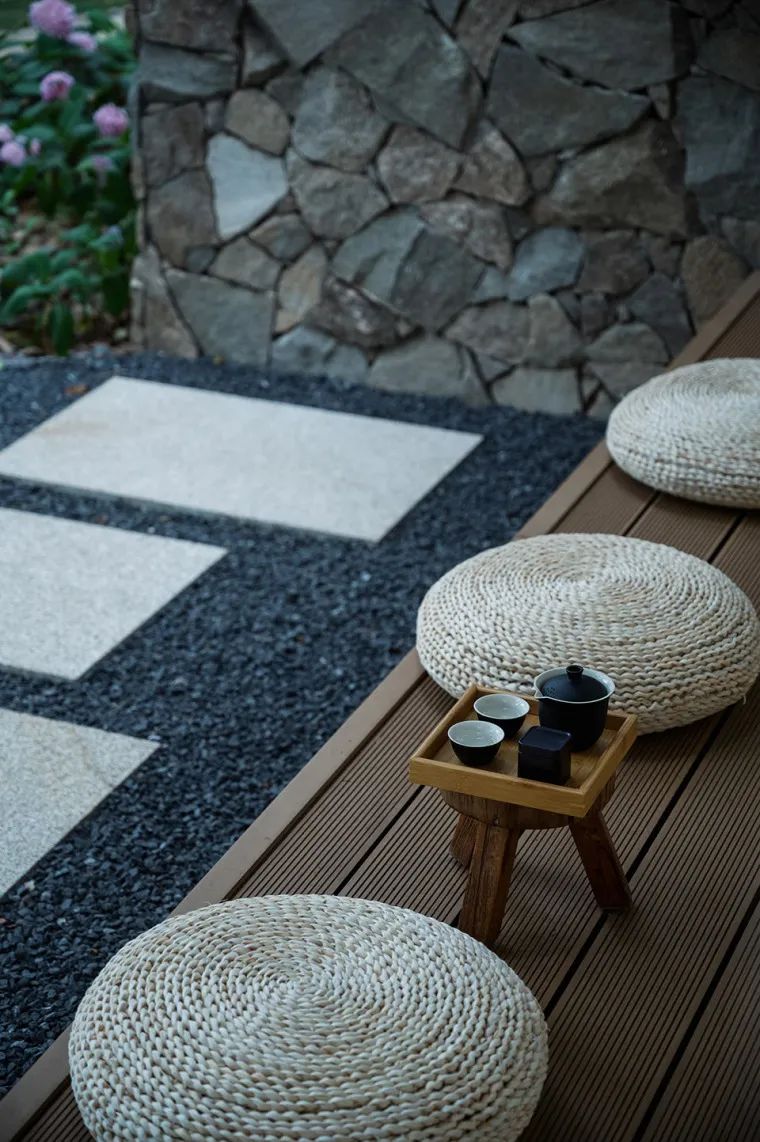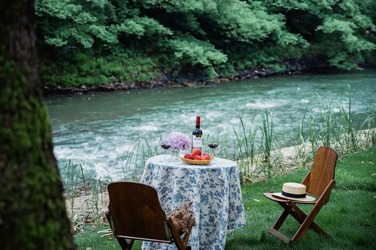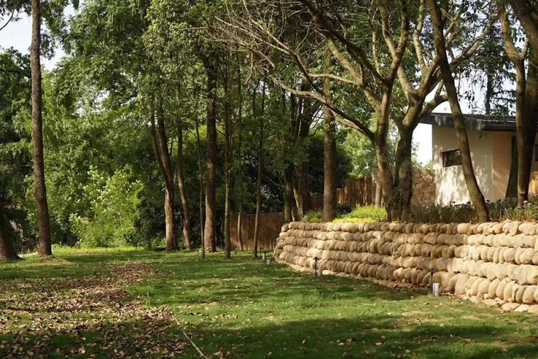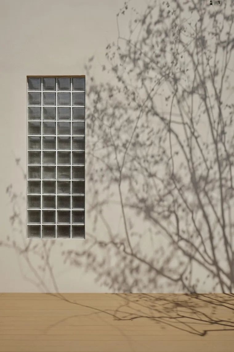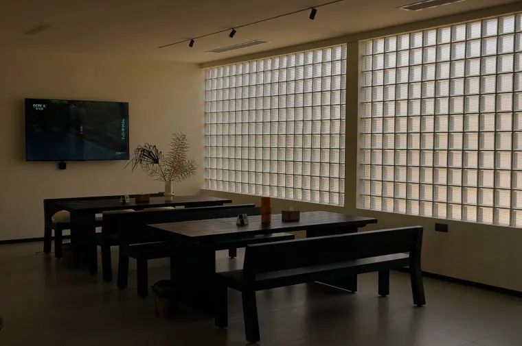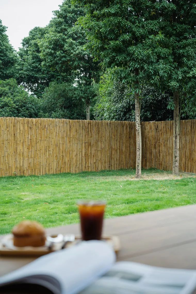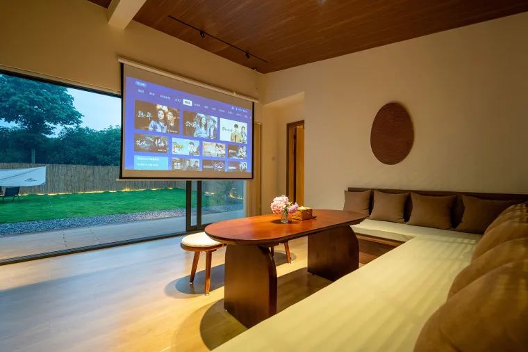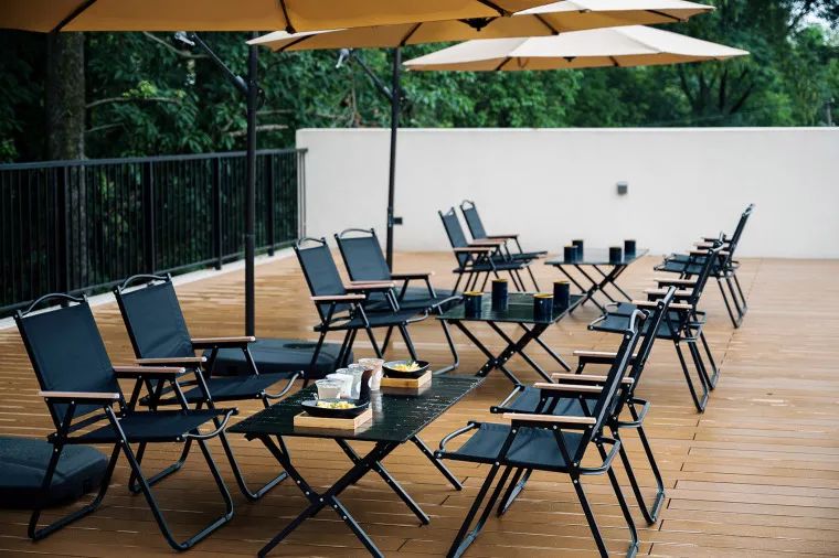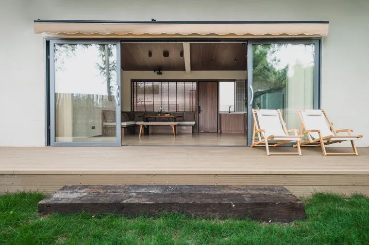 我们对建筑的探索,首先经过一个大面留白的LOGO墙体,自抵达建筑入口之后,随即可见吧台、餐厅、水吧和外摆等构成的公共区域。走廊尽头的楼梯可到访二楼平台,平台高度正处在近旁大树的树冠位置,周围葱郁绿意围绕,树影婆娑,微风习习,还可听闻不远处的溪水流声;自然与建筑共同消融于此刻的恬静与闲适,“微风清幽幌,余日照青林。”建筑前方亲水场地作为多功能户外营地区域,可以举行户外野餐烧烤,以及研学活动,或者在溪水旁边举行草坪婚礼、生日派对等小型集会。靠近自然,临水澄心,静而生道,为久居都市人群提供一方遁世幽所。中庭是一个由四面外墙围合而成见天见地的半户外空间,也连接起了整个建筑的公共区域和客房区域。在承担起公私区域的过渡连通功能之外,中庭同样也是一个小型的活动场所,在这里品茗下棋,伴清风小憩,自在怡然。装饰朴素直白,富于淡雅天趣的审美意境。客房区域设置为三个独立共享小院,分别是悦木、乐土、喜水,均配有客餐厅、厨房、双卧室、私属院落。