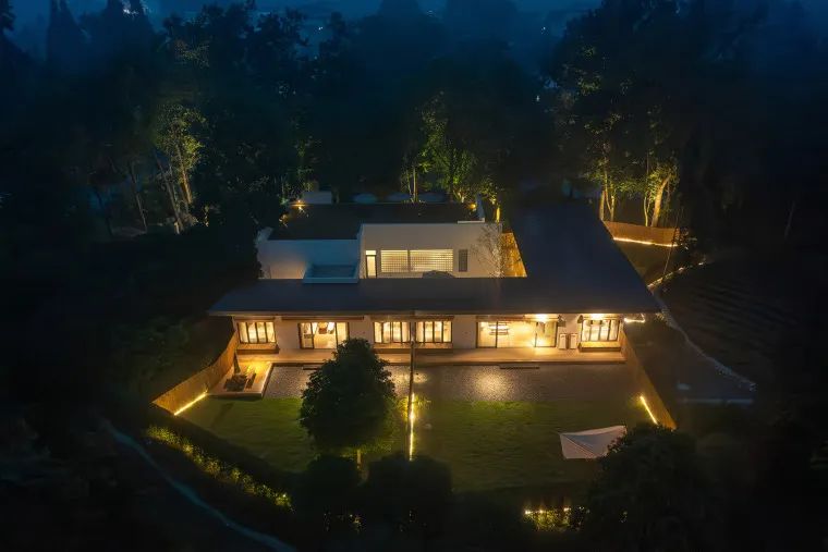 公共区域正对溪流和草坪,客房经由房前院落可面向茶田景观。再者,结合整个场地的自然环境,我们充分运用周边茶田溪流景观、层峦叠嶂的桢楠、青杠及麻柳树等天然绿植,继承传统“川西林盘”民居构筑哲学,将建筑与自然有机融合。也因为周边树木林立,整个客房区域屋顶采用单坡金属屋面,有助于清洁落叶;公区的平屋顶则作为整个场地的制高点,打造成为项目的观景平台。此外,中庭沿用了传统四合院“四水归堂”的建筑手法,寓意“水聚天心,财源恒流”。中庭在保证了公共区域和客房区域便利连接的同时,又能起到空间分隔的作用。这样一种极为原生态、古典天趣的建筑哲学,在今天这个纷繁躁动现代化世界的回归,触动着每一颗焦虑的城市心灵,引发丰富深刻的情感共鸣;建筑空间的诗意表征与治愈人心正是整个建筑给予到访者的第一印象。