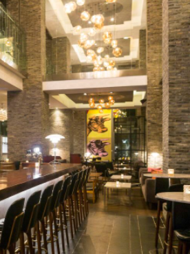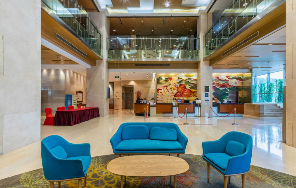 步入宽敞明亮的大堂,尽显高星级酒店高端大气的氛围。中式壁画五彩斑斓,休息区布置着摩登线条的撞色沙发椅,国风艺术与都会气息相辉映,品位不俗。
