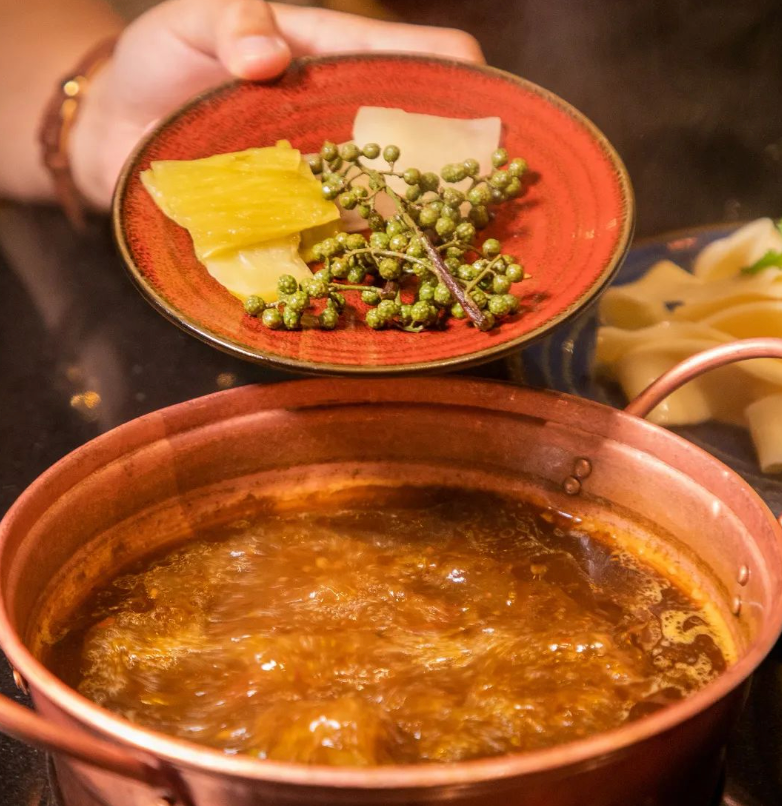 锅底采用高品质的九叶青花椒配合四川老坛泡菜熬制而成,味道咸鲜麻辣,酸味浓郁。青花椒泡菜河鲜锅用来涮烫河鲜是很好的选择,具有去腥保鲜的效果。
