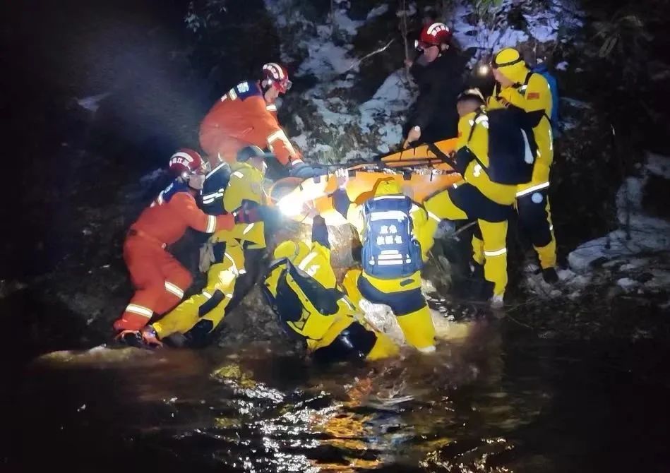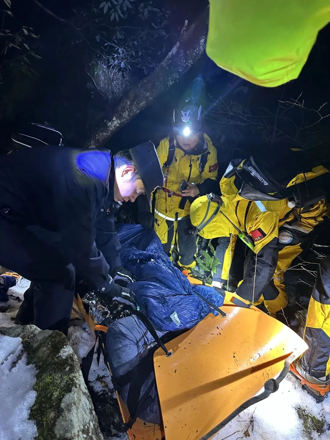 救援人员顶着头顶微弱的灯光,摸黑分析地形,最终决定顺着水流将小陈缓慢送至下游岸边。定下救援方案后,救援人员纷纷跳入冰冷刺骨的溪水中,将小陈抬至担架上,并用锡箔纸、睡袋将身体包裹严实,用救援绳固定好防止二次受伤。一场警民合力徒步攀登山崖的生命接力,在零下5度的低温天气下艰难展开。大家齐心合力,一起高喊“一二!用力!一二!用力!”,费了九牛二虎之力,终于将小陈抬至安全区域。