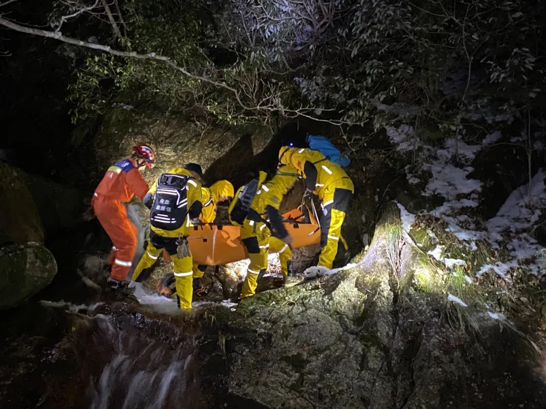 救援人员顶着头顶微弱的灯光,摸黑分析地形,最终决定顺着水流将小陈缓慢送至下游岸边。定下救援方案后,救援人员纷纷跳入冰冷刺骨的溪水中,将小陈抬至担架上,并用锡箔纸、睡袋将身体包裹严实,用救援绳固定好防止二次受伤。