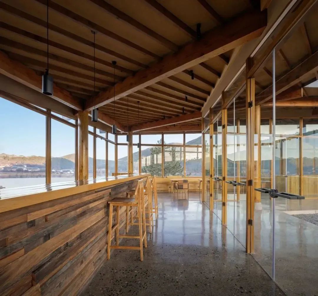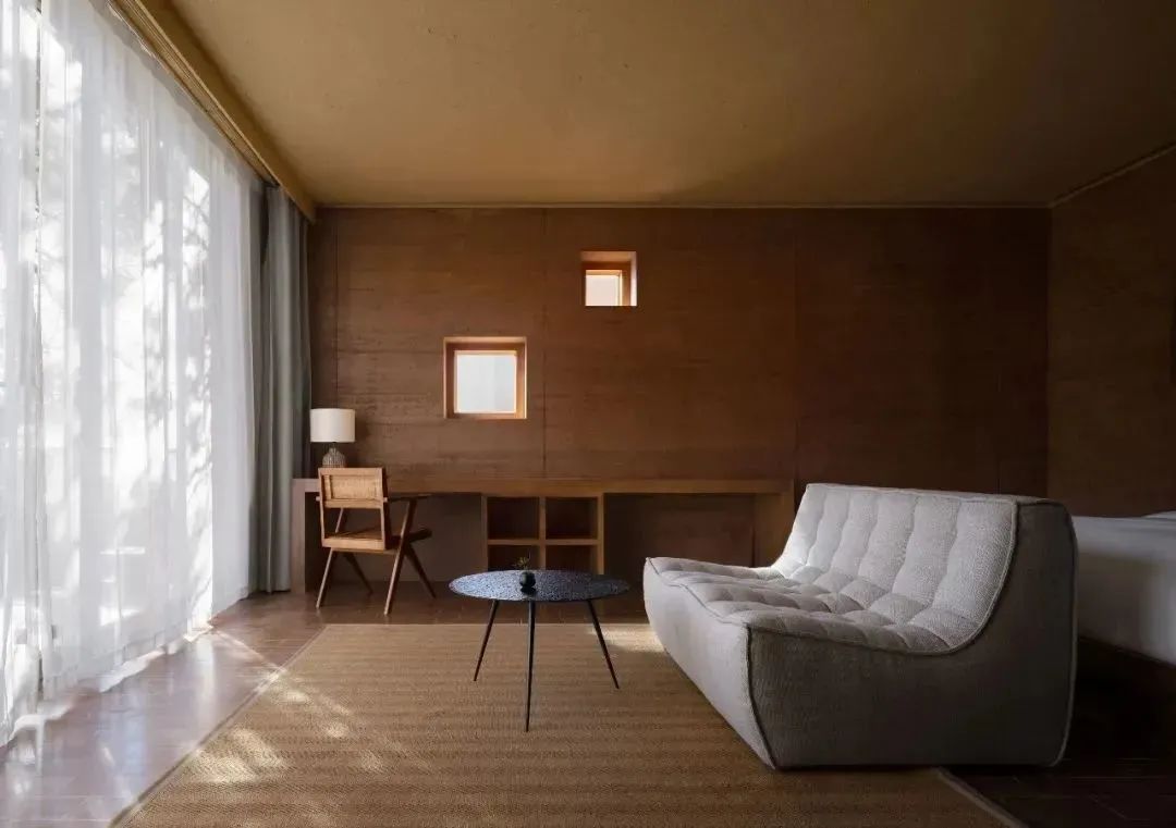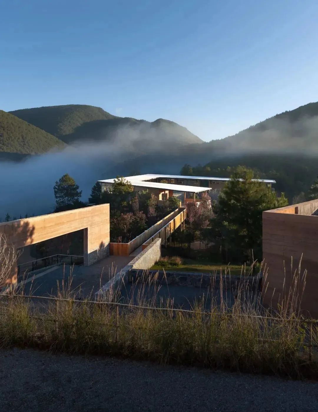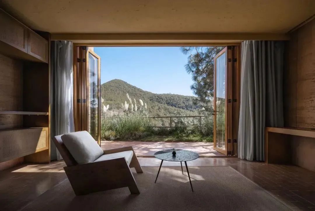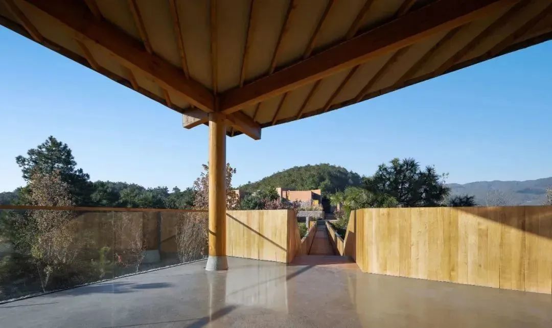 在我们的设计里,土木材料自带的天然橙与红带来了一种温暖的幽暗,呈现出安静而私密的室内空间氛围,自然的风景则是它的反面,明媚与雄奇愈加感染人。我们希望体验者从中穿行,串联起一条乐山乐水的收放自如的流线,从公共区域的全景式视觉体验,到居所中定焦式的观景体验,自得其乐。
