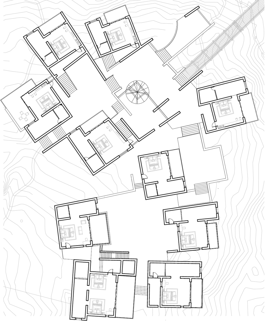 中国传统建筑的魅力,聚落是大于单体的,我们将传统内向型的居住单体,设计成为适合旅行者的景观外 向型的单体,依次经过入户庭院,玄关,卫浴与客房空间,到达景观平台,以此为一个单体原型,进行重复组合,依地形散布在基地之上,单体与单体则互相 错落,形成被围合的小型社交公共空间,形成了一个由 10 户小住宅组成的聚落。