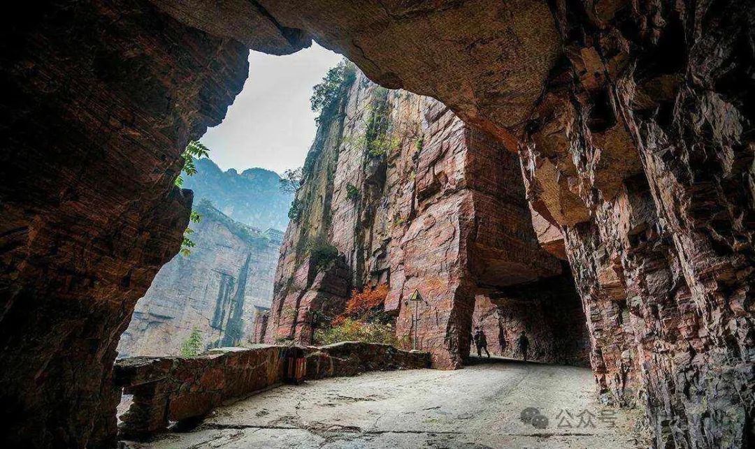 这条挂壁公路,长约1250多米,洞顶是嶙峋的怪石,开凿时留下的支撑廊顶的天然石柱,形成了崖下的“照明窗口”,被游人交口赞誉为“世界第九大奇迹”。