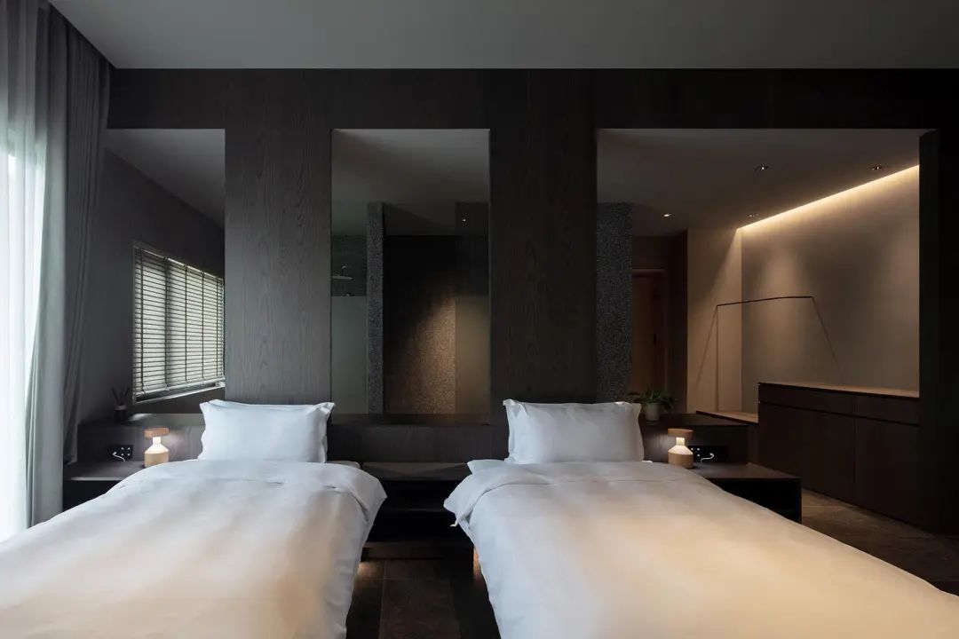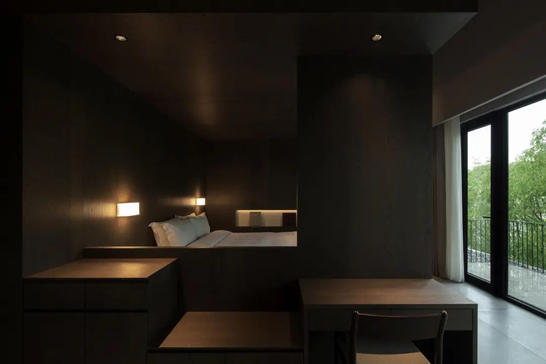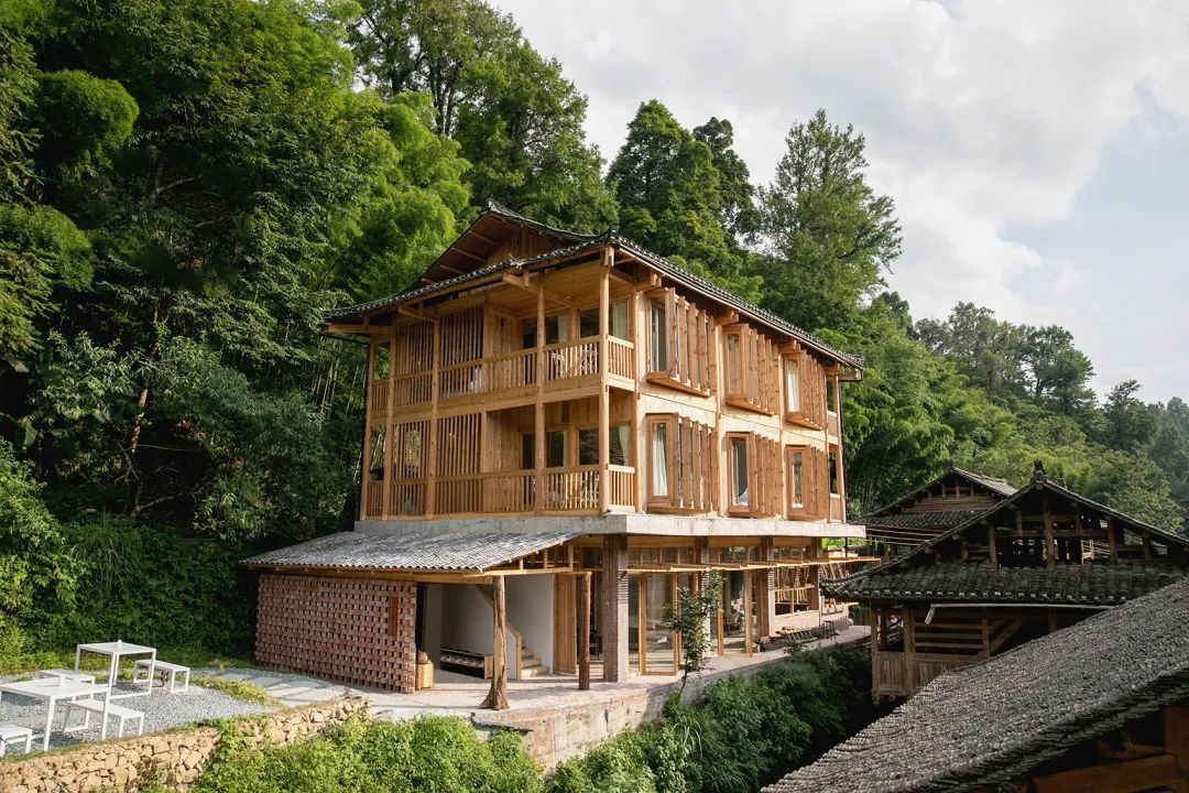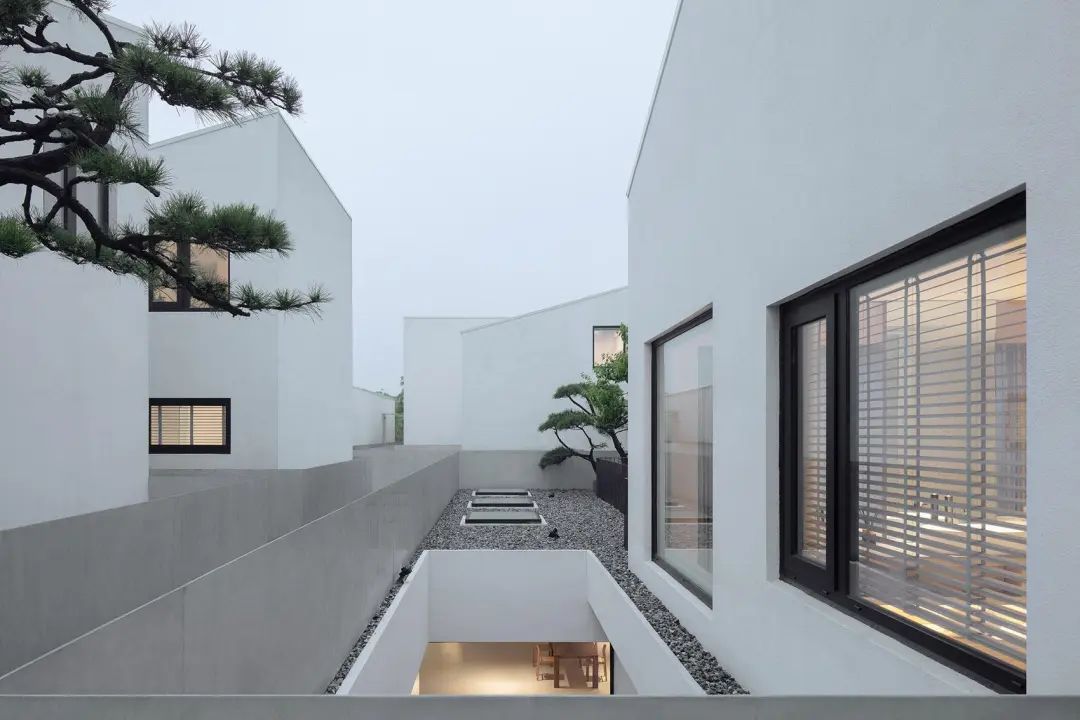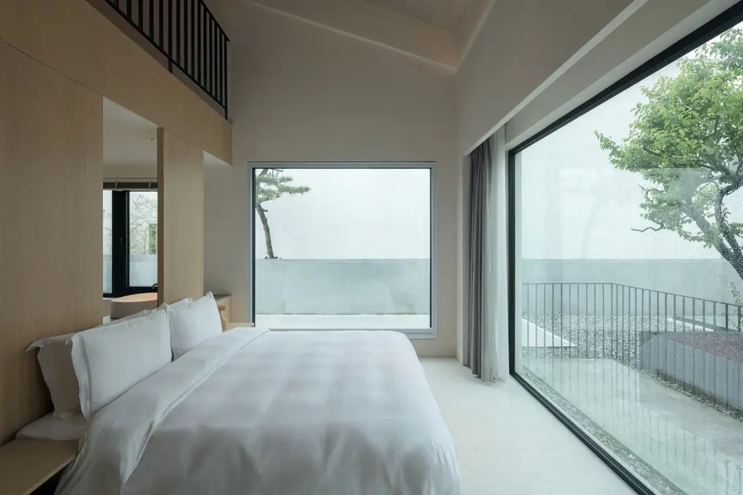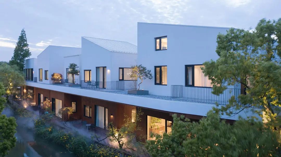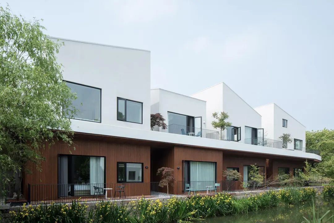 江南半舍民宿由B.L.U.E.建筑设计事务所设计,青山周平作为其中的一员,将现代建筑风格和江南传统美学相结合,打造出温暖且有质感的住宿体验。民宿由10幢独立别墅组成,每幢别墅上下两层,上层为独立房间,下层则主要是共享公共空间及功能区域。