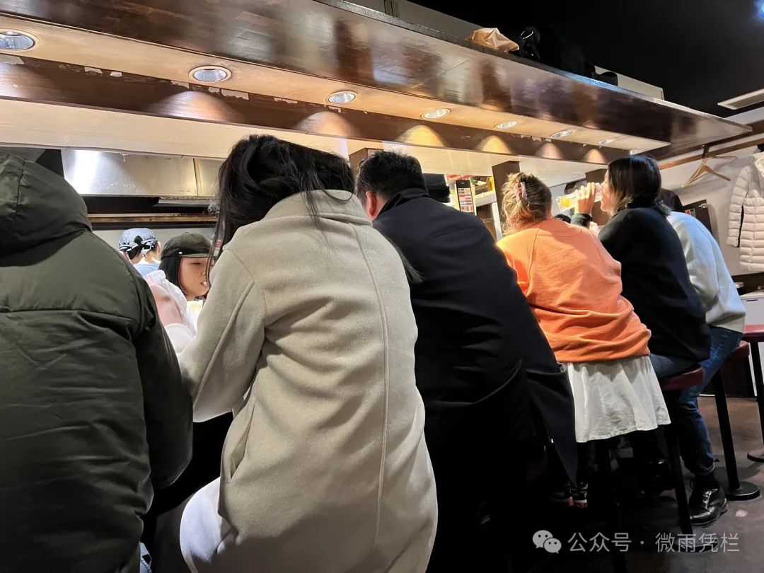 吧台一溜烟已经排排坐吃果果了,下面的客人只能挤嚓嚓其乐融融了,好不容易被安排落座,小哥笑容可掬用标准的日本英语和小妞儿哼哈二将,也倒是快速下了单,耳边不时传来高葫芦大嗓门山东大汉般豪爽的笑,然后就又是年轻女子快乐而毫不掩饰的大笑,此起彼伏。哇塞,这拥挤的小气氛倒是蛮温馨,快乐是会传染的情绪,我刚准备看看那些神情, 妞儿迅速用眼神管制了我的张望,呵呵,我只是想问,都这么快乐吗?