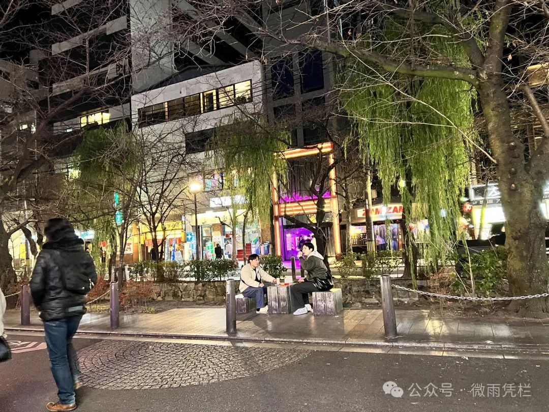 京都,灯光璀璨,已经在开始布置圣诞,小河流水潺潺泛着霓虹的倒影,两个年轻人不避寒凉地在石桌石凳上对酒当歌,这,就是生活……