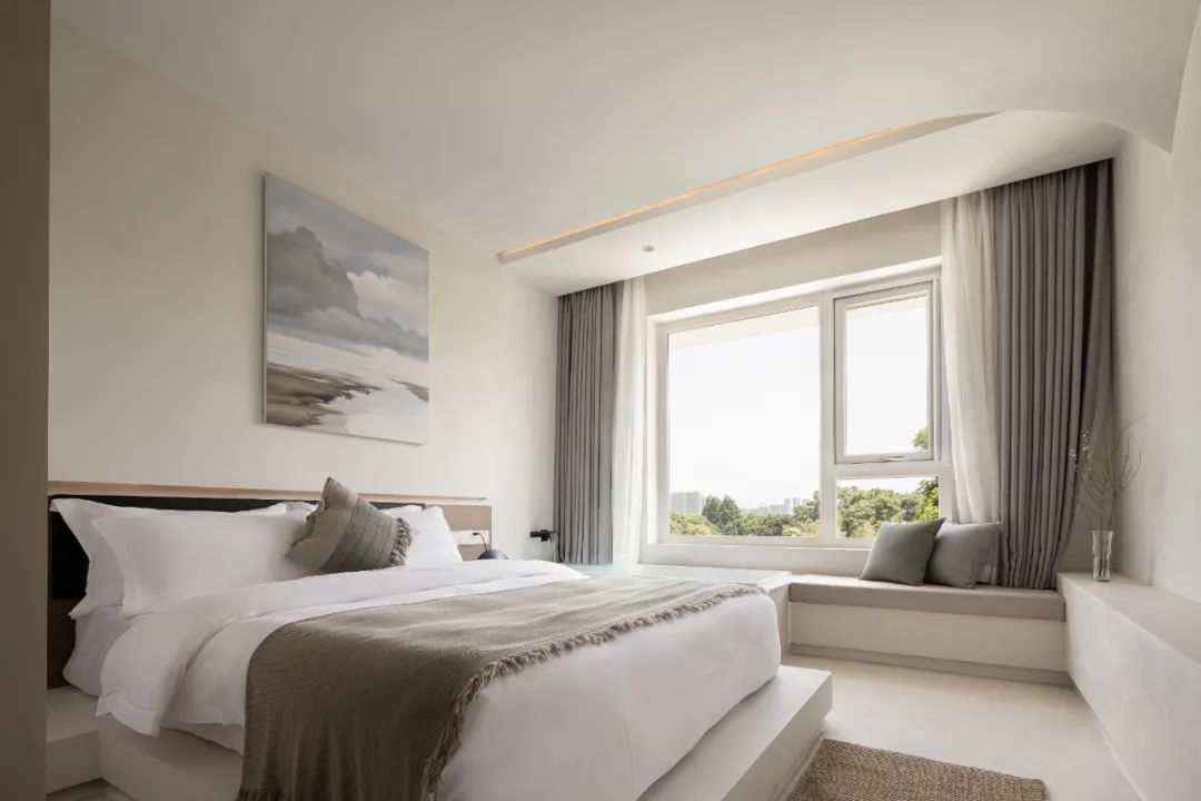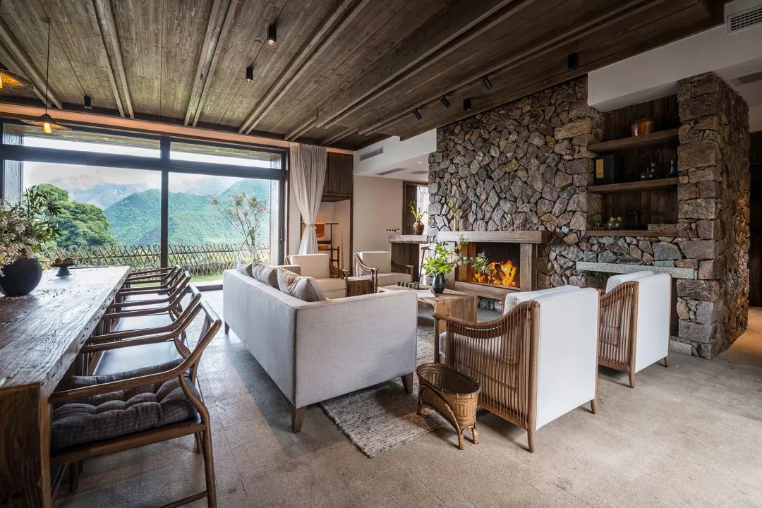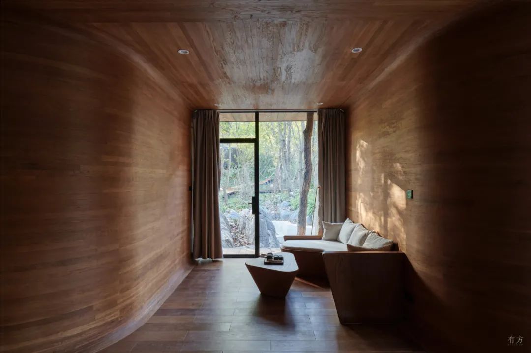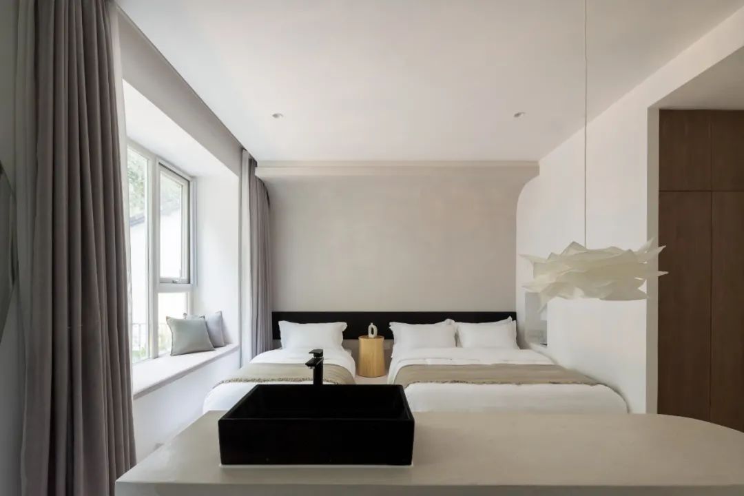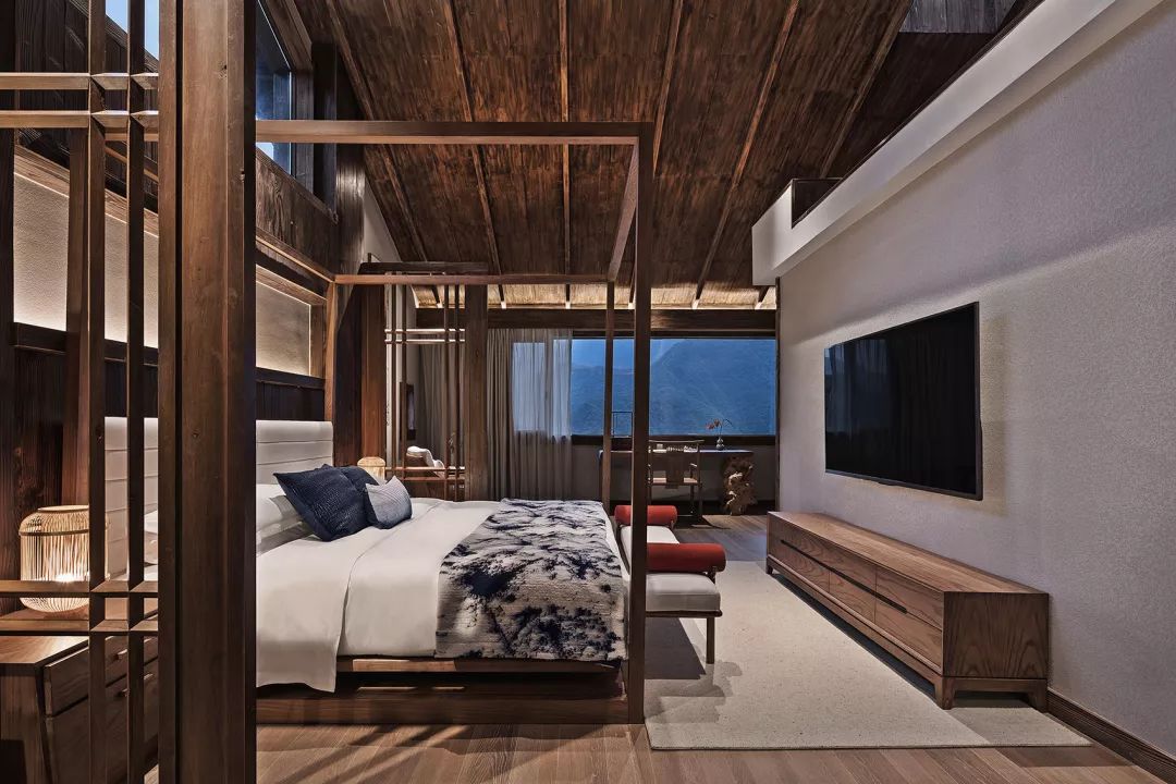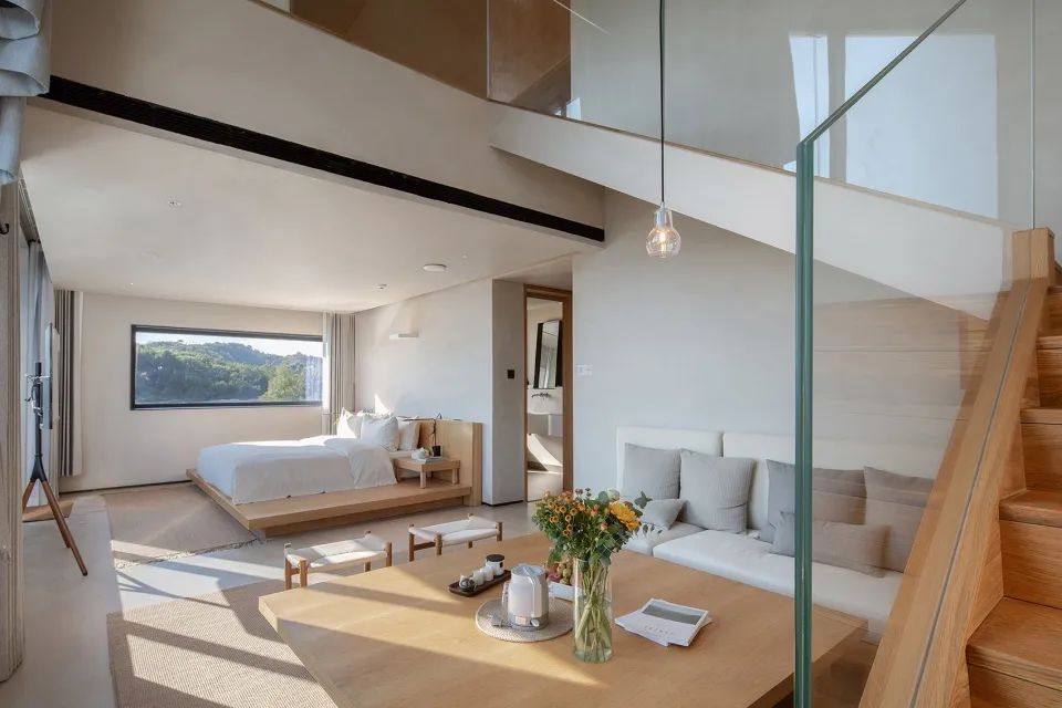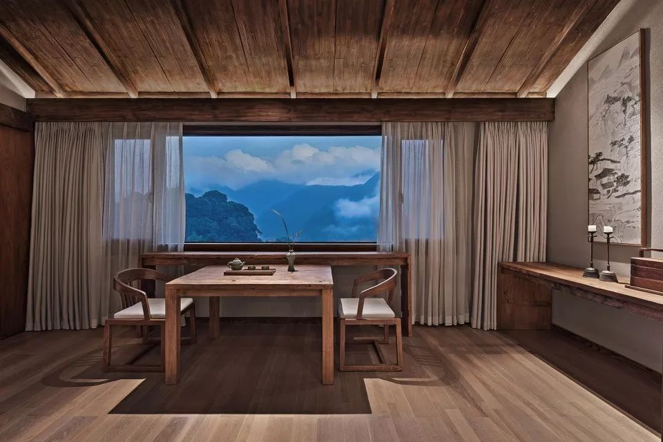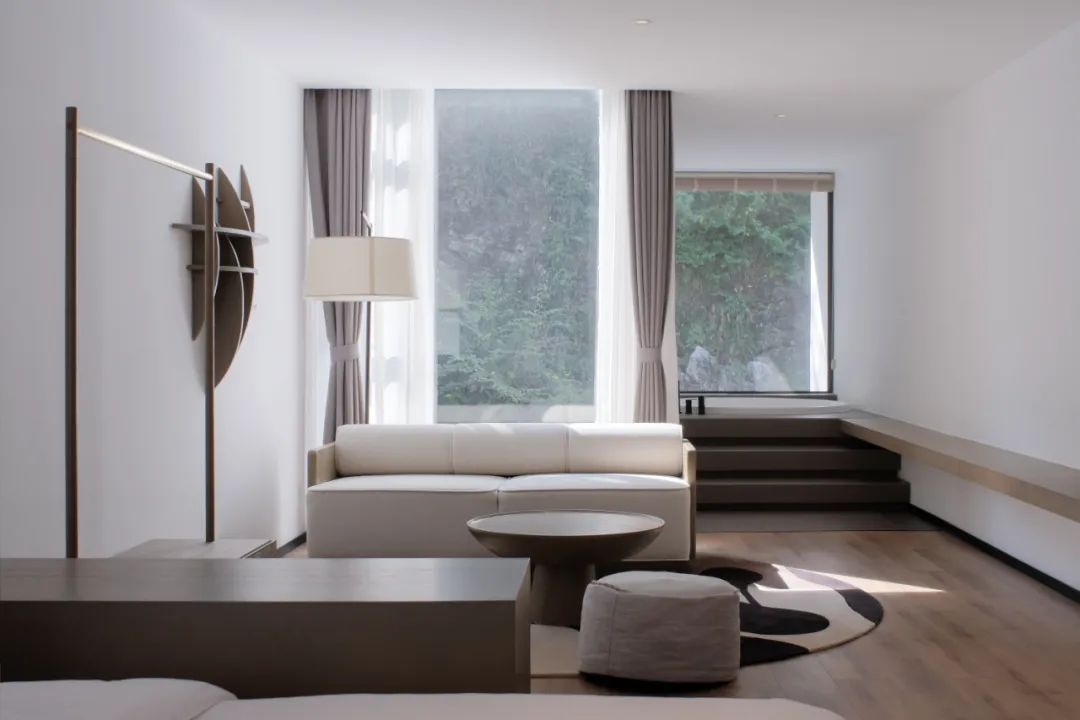 一层客房空间宽敞,室内家具尽量简洁,但功能完善,按观景、饮茶、卧室、阅读的生活方式划分空间形态。每间客房内都有大小形态各异的窗子,融山聚水,好似一幅横轴风景画。