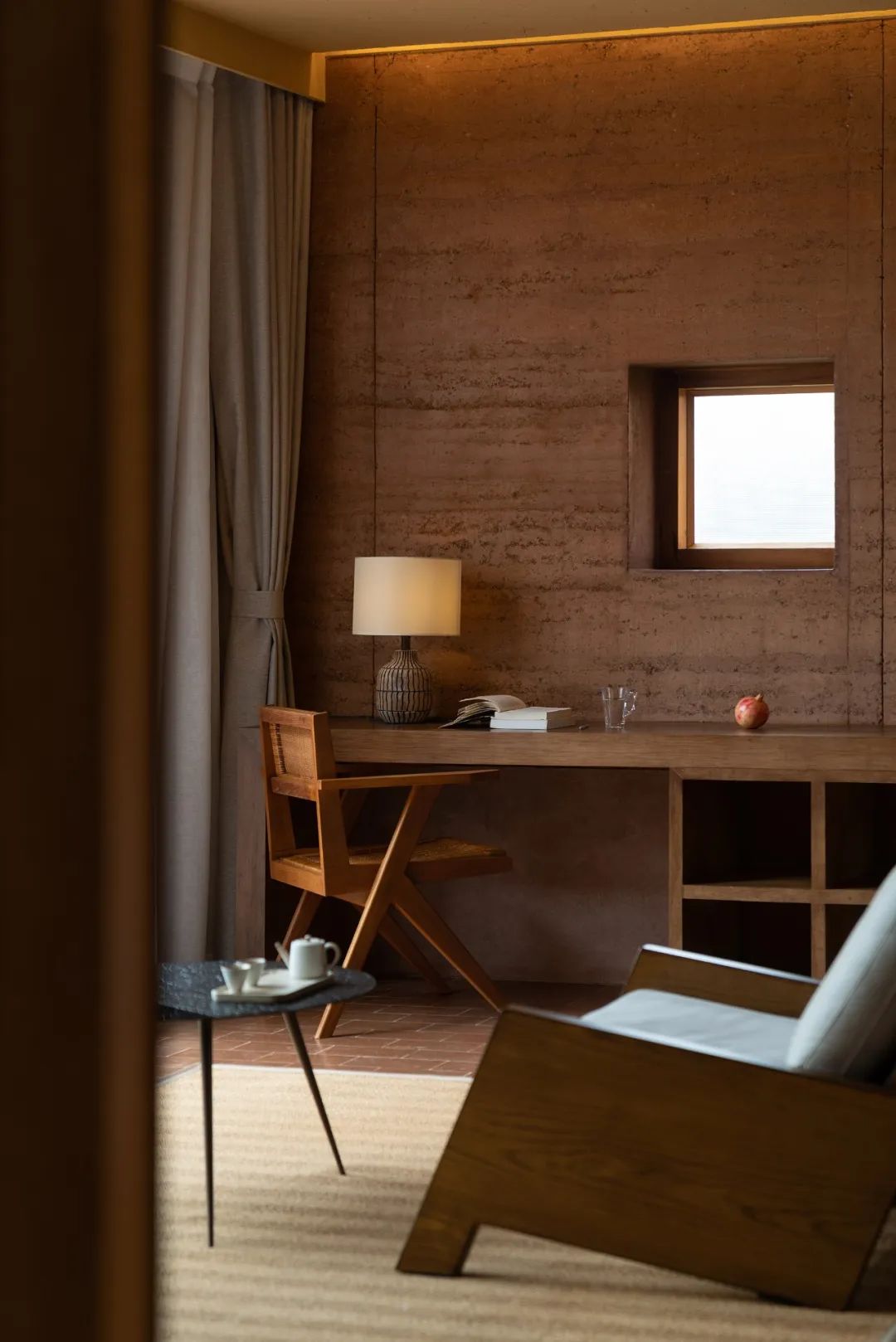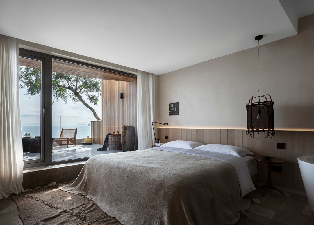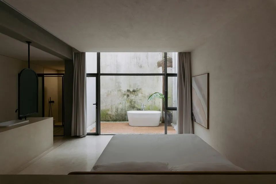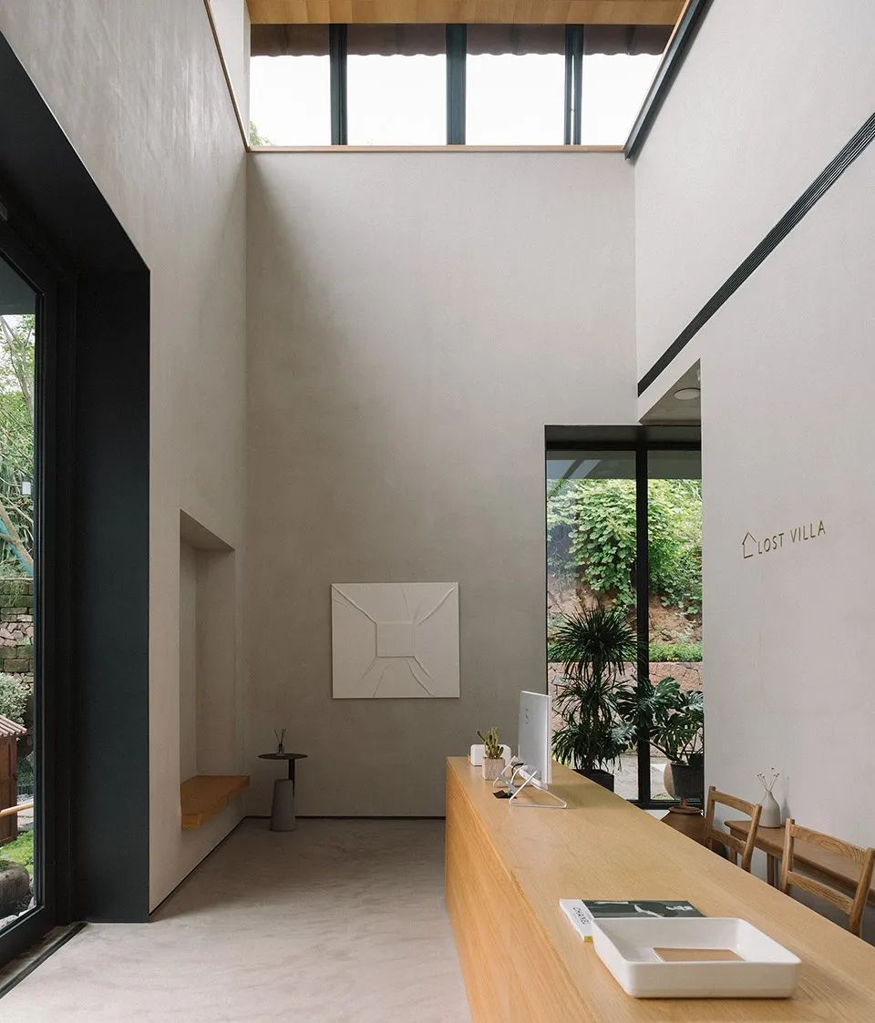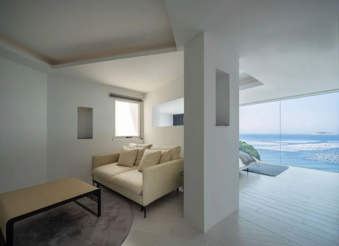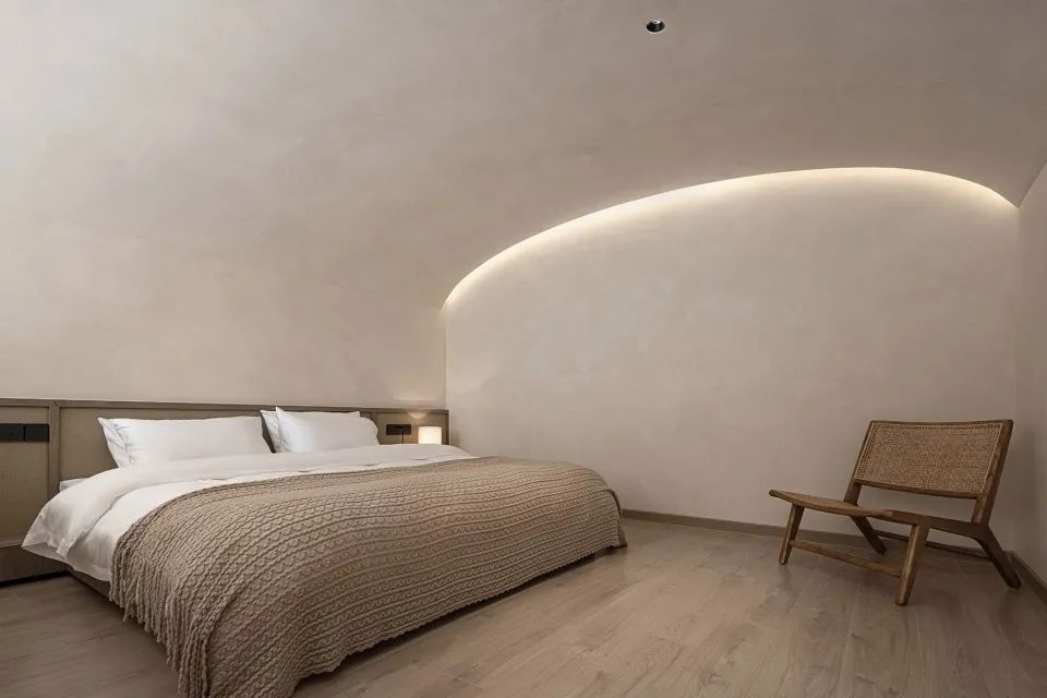 一层客房空间宽敞,室内家具尽量简洁,但功能完善,按观景、饮茶、卧室、阅读的生活方式划分空间形态。每间客房内都有大小形态各异的窗子,融山聚水,好似一幅横轴风景画。