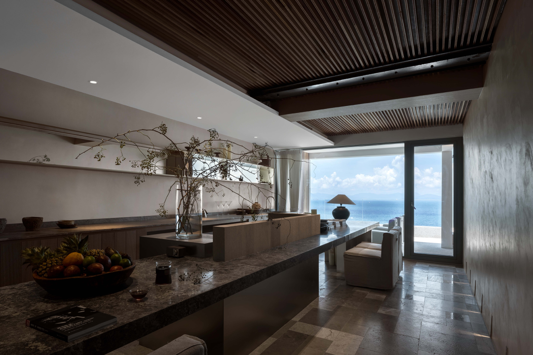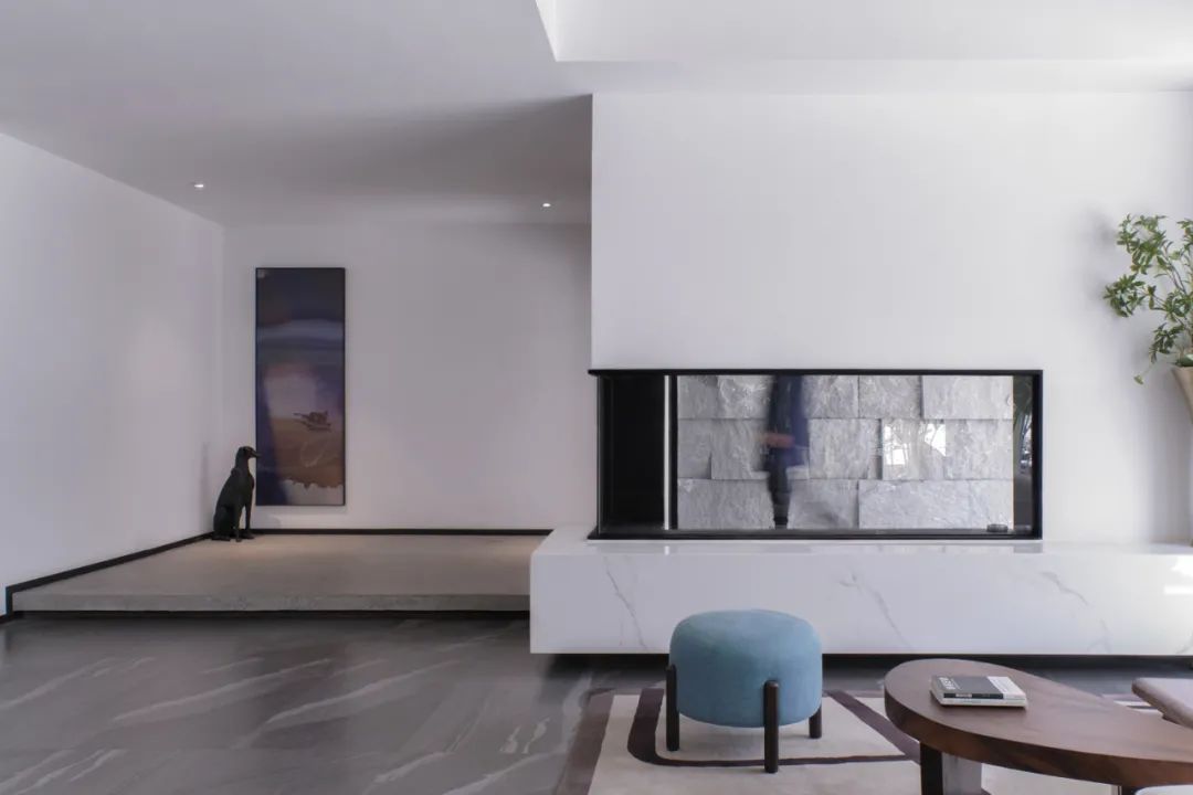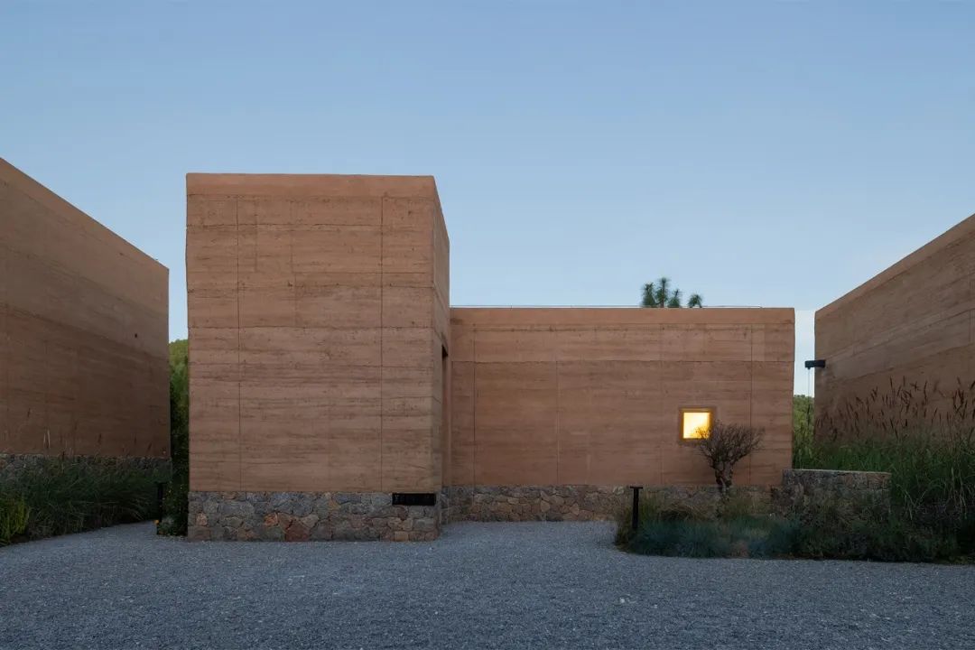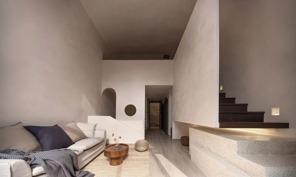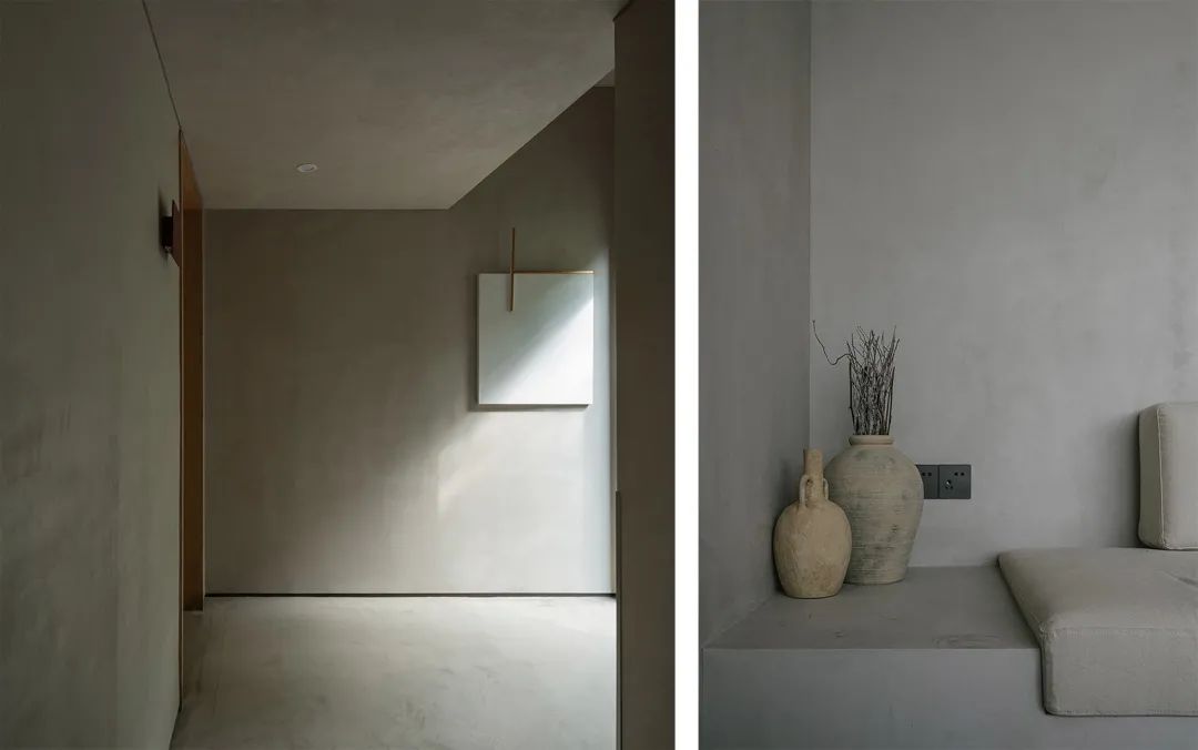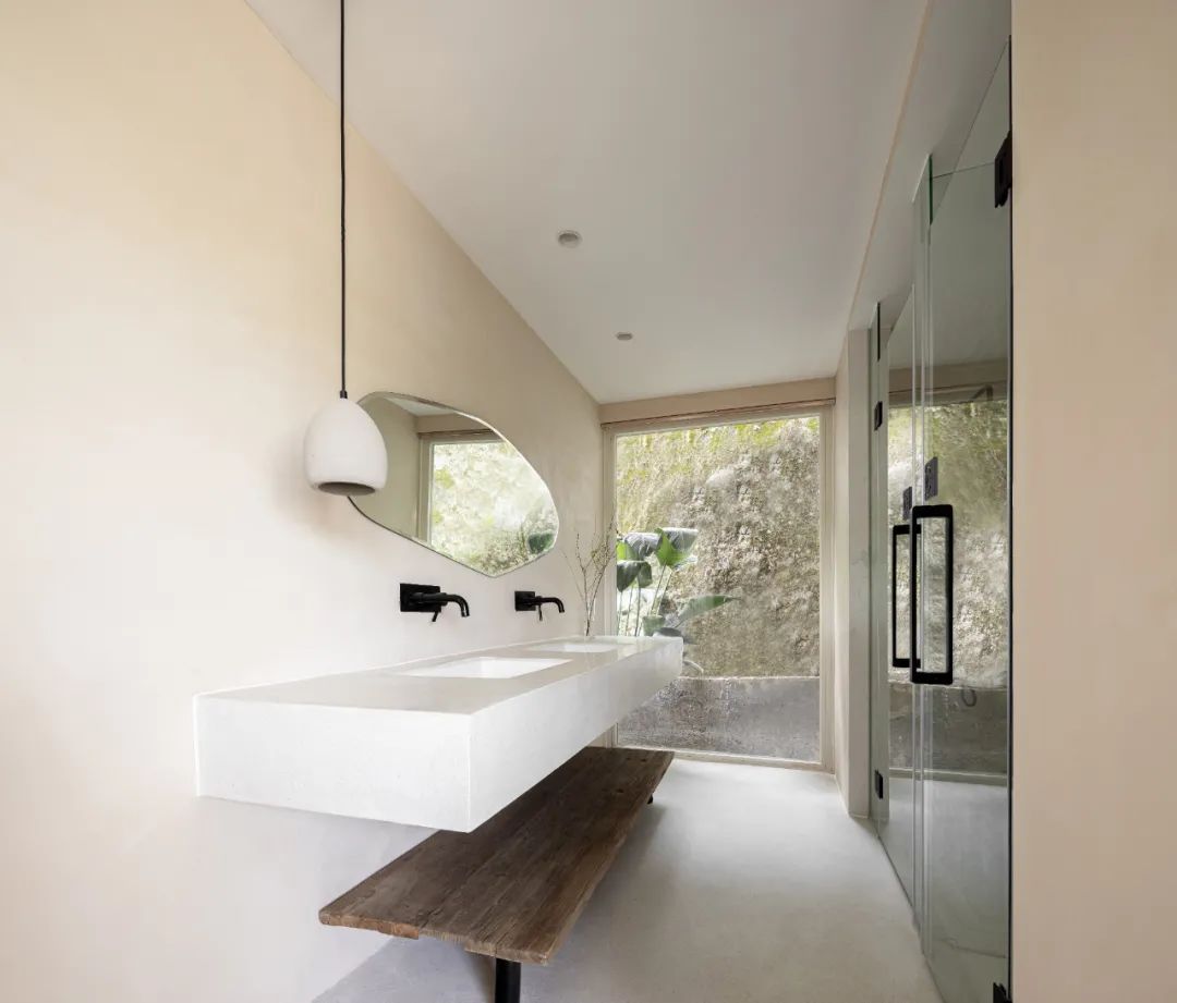 两栋小屋因环境不同也存在造型上的些许差异:一栋隐匿在乱石与树林之间,各房间的开窗是对近景的窥视;另一栋则裸露在石阵之上,与巨石峭壁及一颗独木互相依偎,便多辟了一片天窗可以遥望星空。小屋的客厅与周边石阵环绕之地用米白色的水磨石修补四周,待池水满溢之时,便会体验大自然粗粝的质感与人造材质的细腻所带来的愉悦。