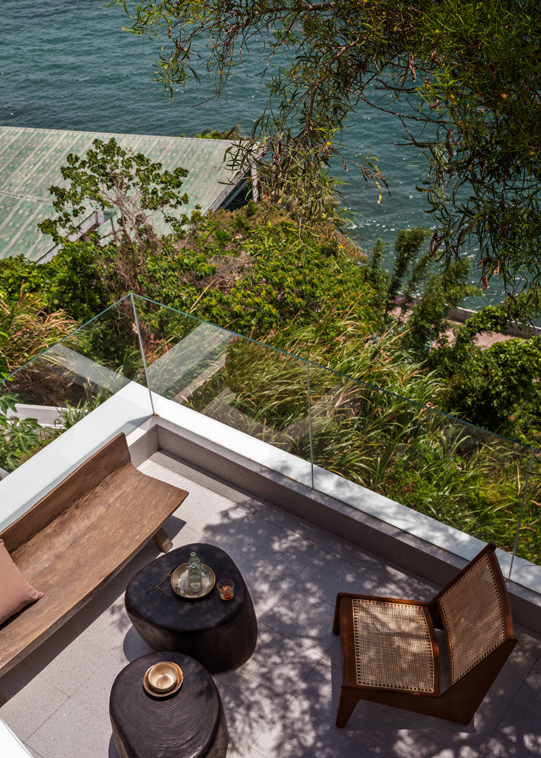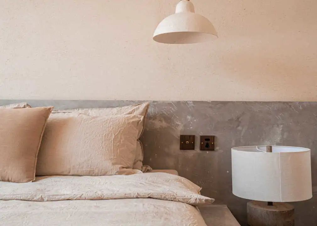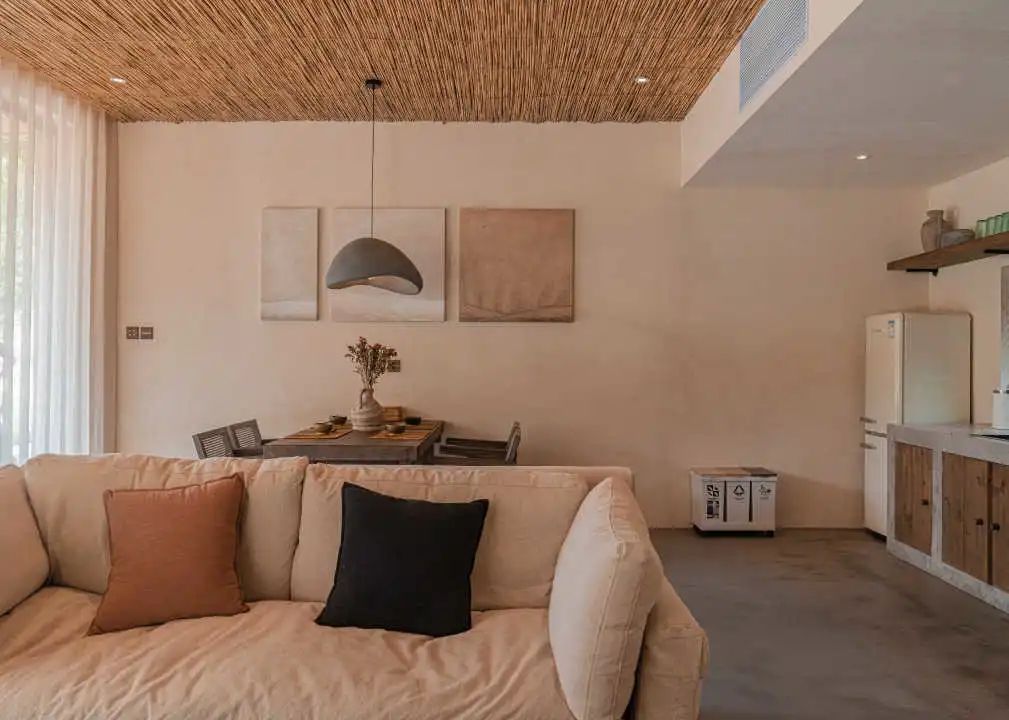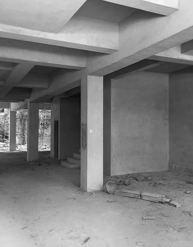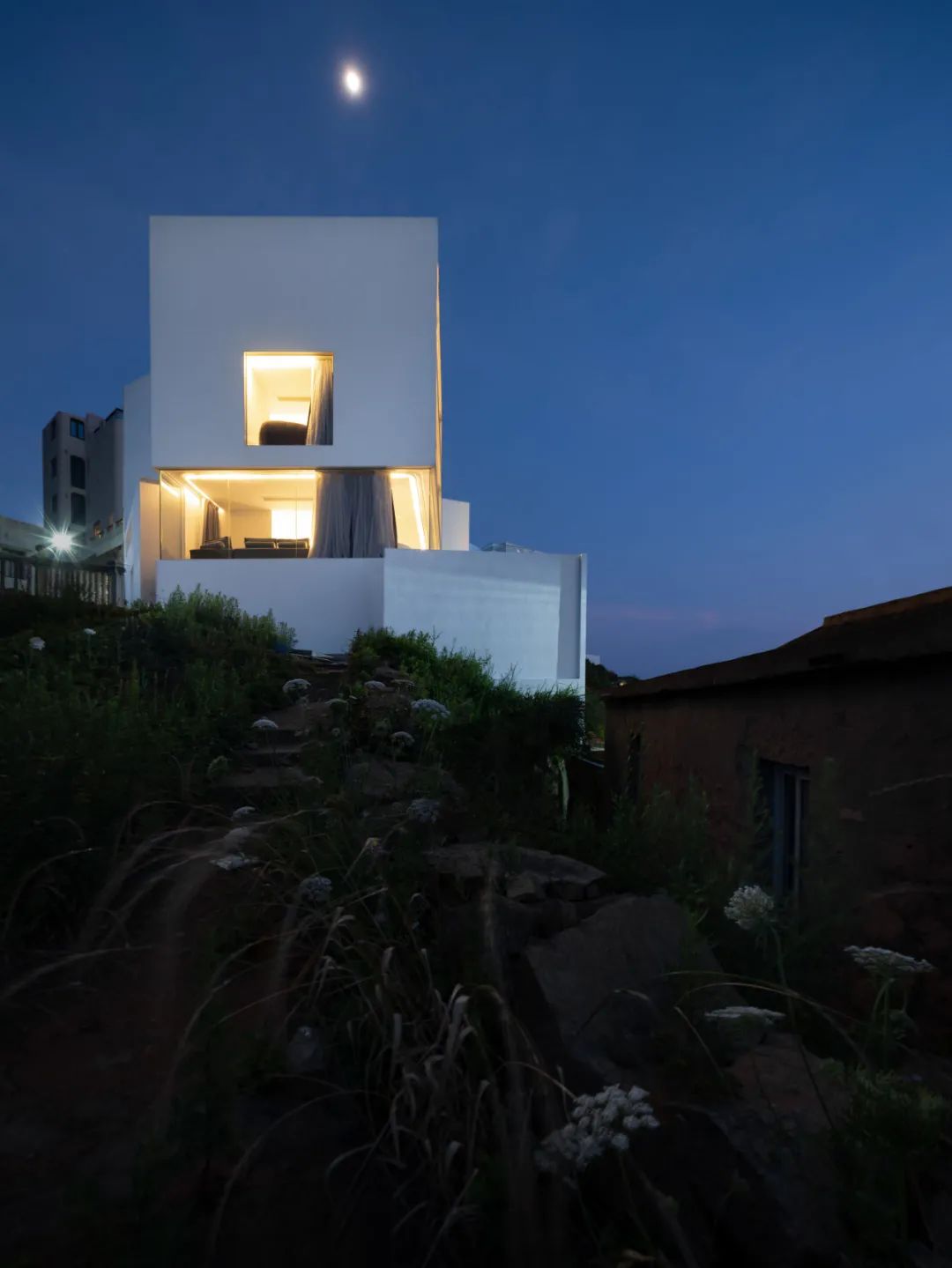 两栋小屋因环境不同也存在造型上的些许差异:一栋隐匿在乱石与树林之间,各房间的开窗是对近景的窥视;另一栋则裸露在石阵之上,与巨石峭壁及一颗独木互相依偎,便多辟了一片天窗可以遥望星空。小屋的客厅与周边石阵环绕之地用米白色的水磨石修补四周,待池水满溢之时,便会体验大自然粗粝的质感与人造材质的细腻所带来的愉悦。