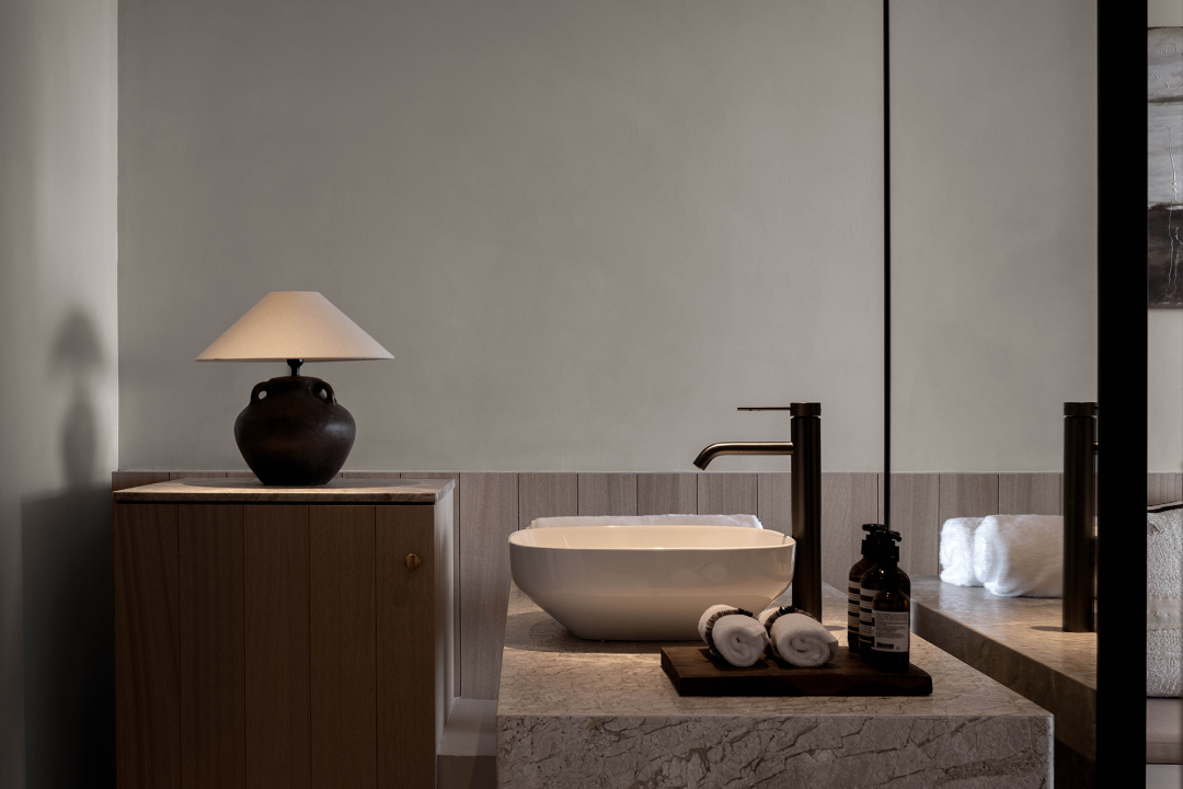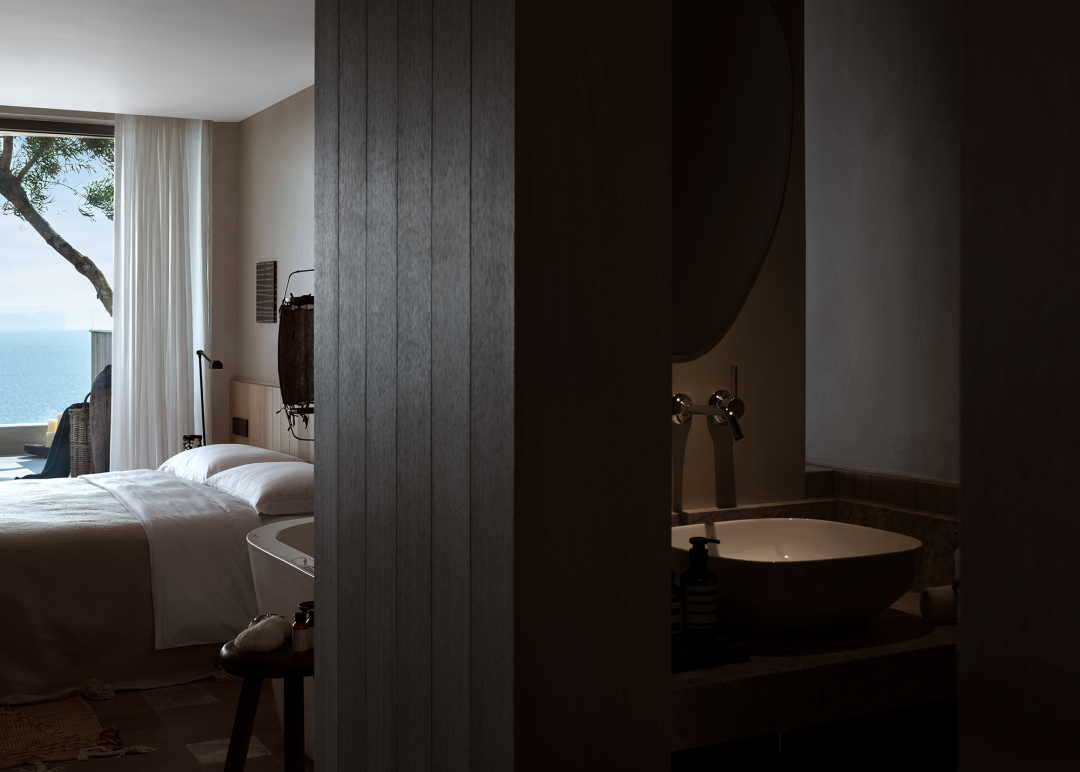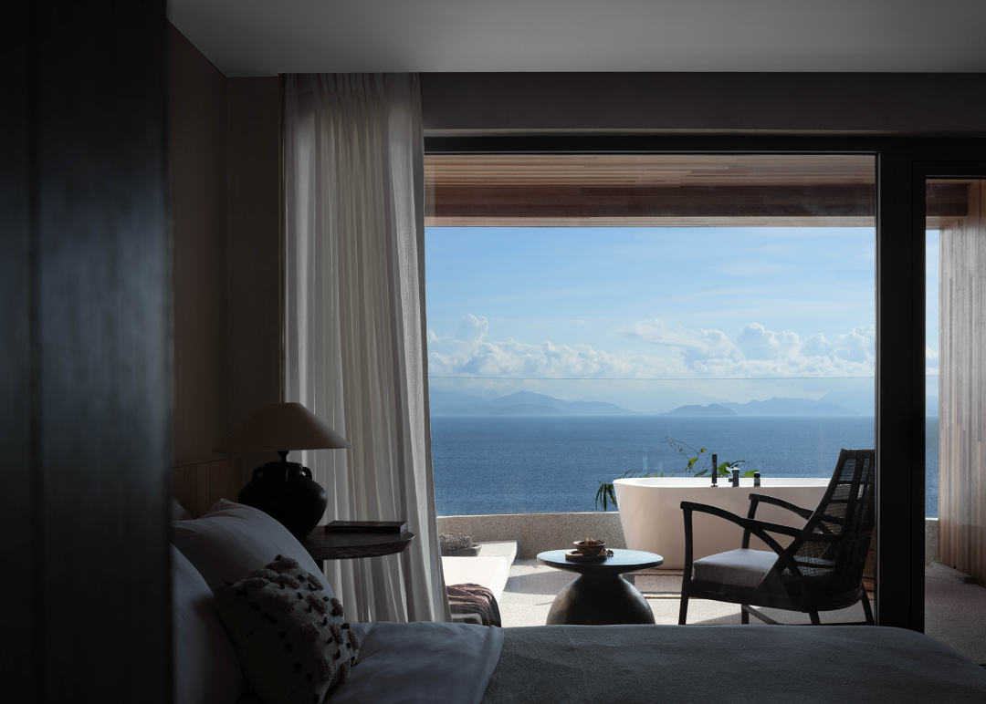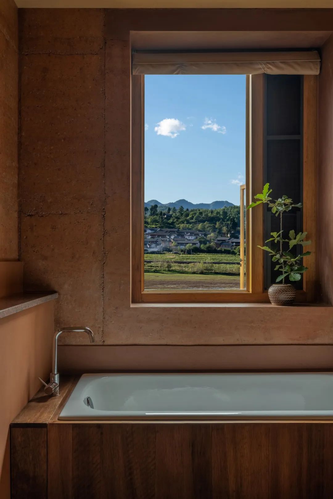 在「空山九帖·秦岭」的客房体系中,卫生间与主体生活区域由X轴向平行并置,内部功能由Y轴向依次排列。方形浴缸位于景观最前端,与空旷的阳台相连,勾勒出两种躺着看风景的姿态。此时,沐浴所带来的放松感觉成为观景体验的一部分,而被葱葱郁郁的山林环绕的沐浴也构成了独特的居住体验,给人提供了近似露天沐浴的野生质感。几乎没有视线阻挡的秦岭断面扑面而来,我们在这里,呼吸着森林的清流,倾听着秦岭的脉搏,饱览的是无与伦比的秦岭正观立面。
