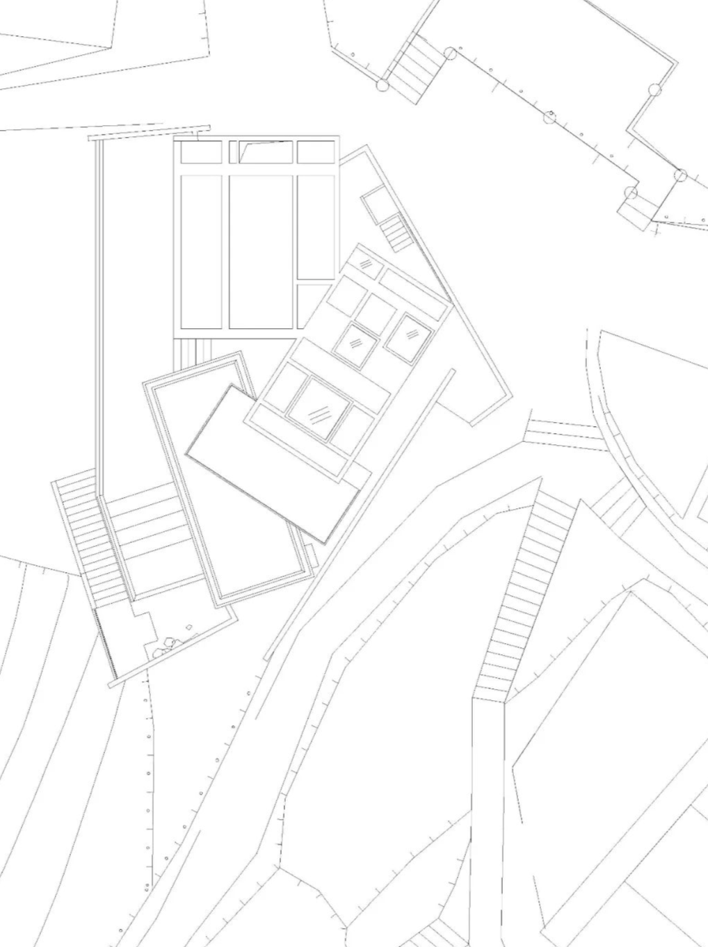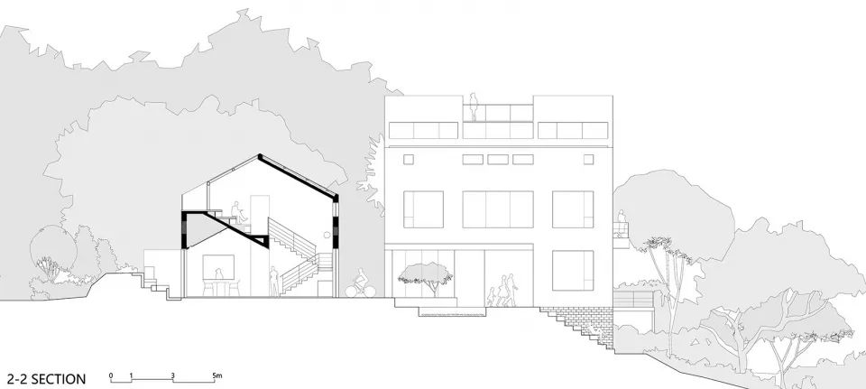 树林中盘旋的藤蔓是第一类小屋形态的概念来源。大自然预留出不同大小的空间来挤压出木屋内部的功能房间:客厅、卧室与卫生间。滑梯与台阶构成的廊桥穿越树木之间狭窄的缝隙,或缓和,或陡峭,将三个主要的房间缠绕成一栋完整的建筑。