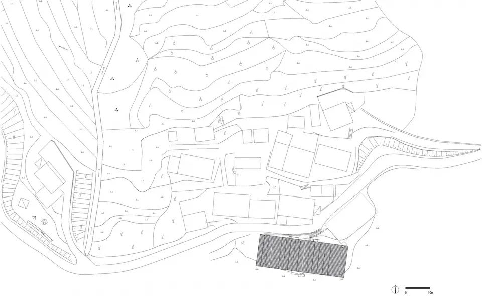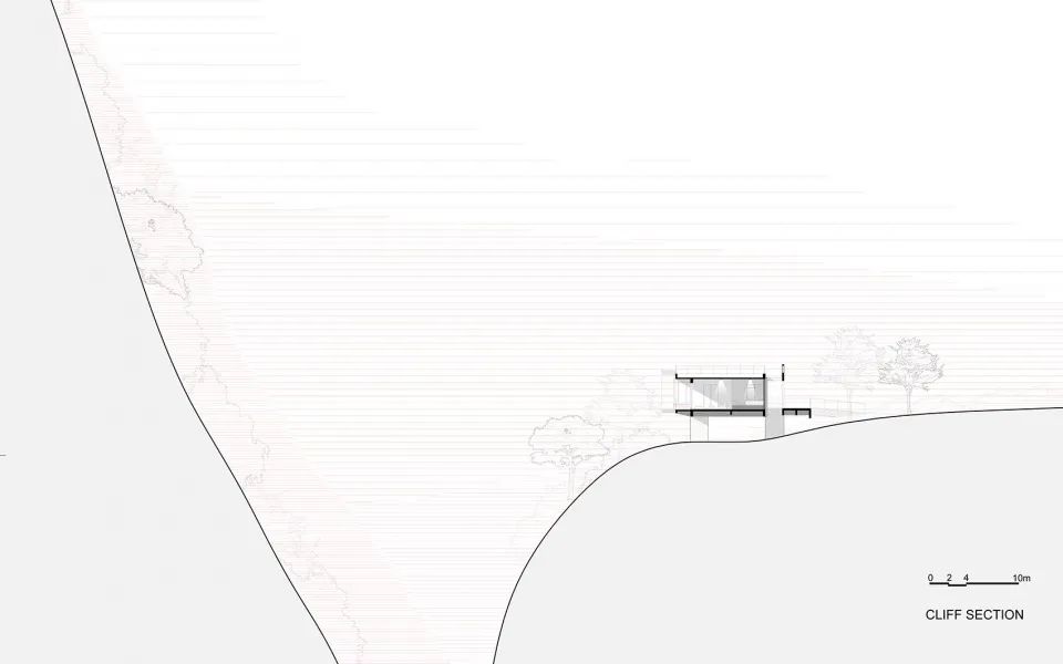 建筑与场地借助“气流”的概念建立了一种轻质的联结。建筑彷佛停留的舱体,被流动于悬崖和山体间的气流微微托起。