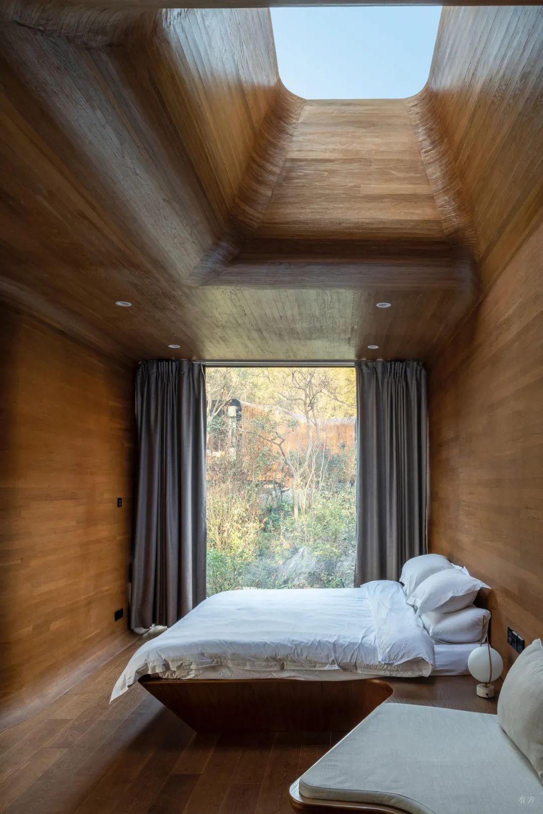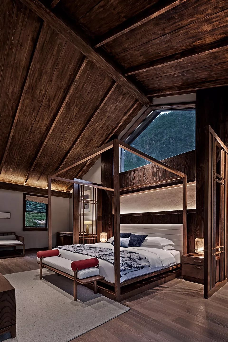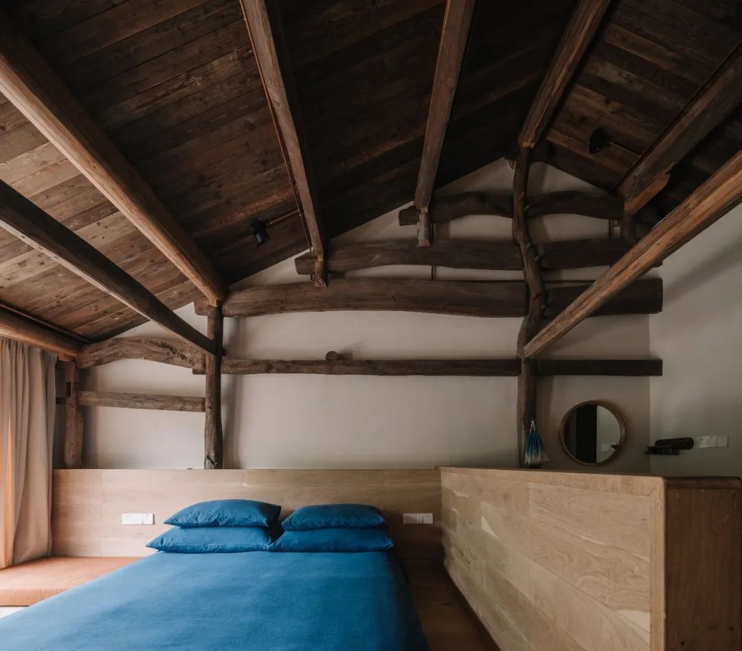 ▼架子床与斜屋顶的大天窗相得益彰