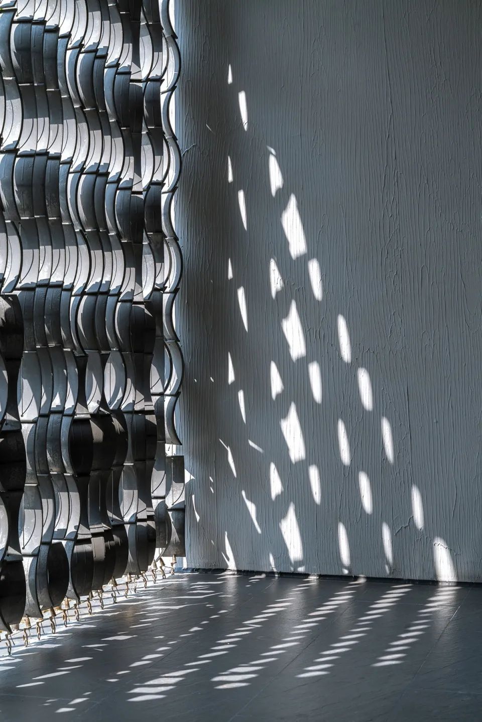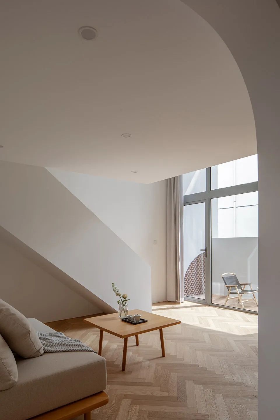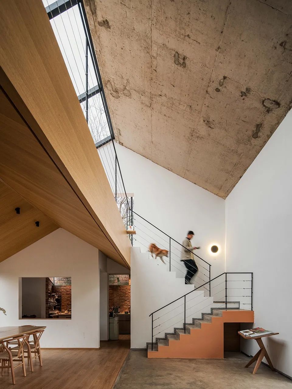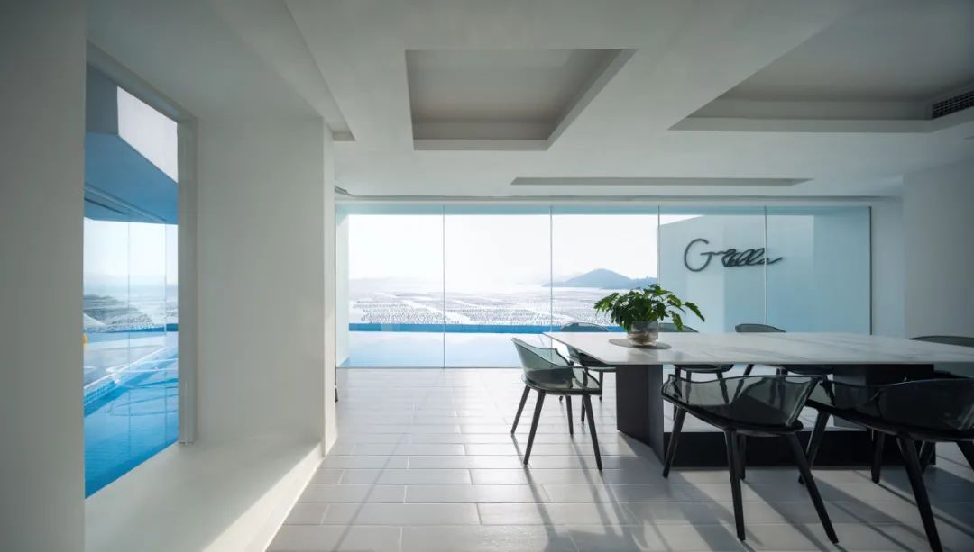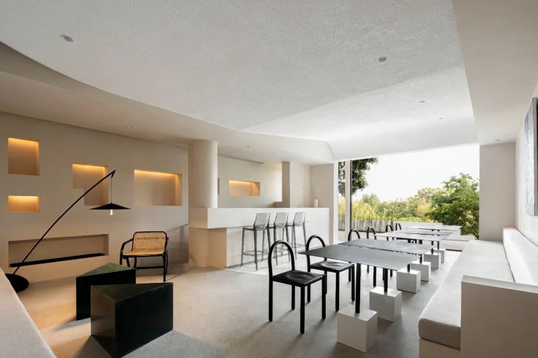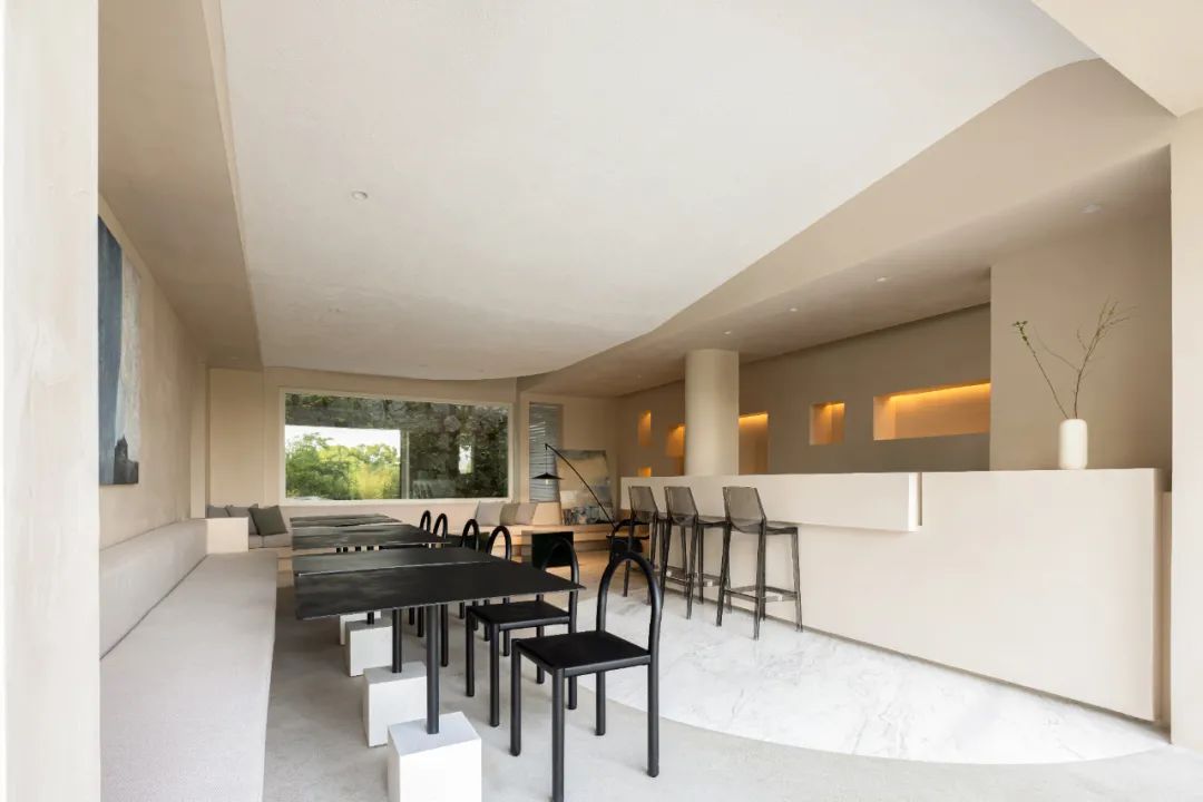 空间是人群的聚集,给予人类交互的可能性。设计师赋予空间以优雅、娴静、自然的大方,引导人们停顿、凝望、小憩、交流。玻璃嵌入屋顶,让光影从空中轻盈流泻,与侧面跃入的光线层层交织,互相辉映,明亮了空间的视野,提升了人群交流互动的可能性。纵横交错间生成形式上的变幻,感受明与暗的对比,以表达建筑的艺术哲学,增加了空间的趣味性与生动感。