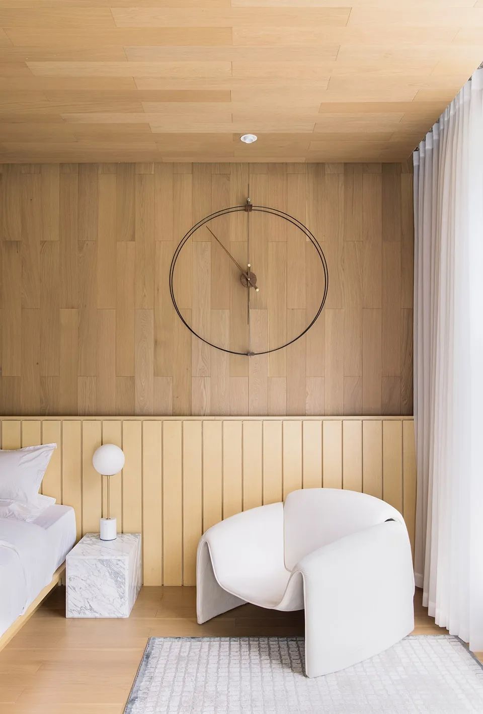 室内的空间是整个室外表皮的向内偏移,圆润的倒角与同样的橡木材质模糊了地面、墙面与屋顶的界限,主要的家具延续了自由的曲线造型,以作为室内功能中必要的一部分。