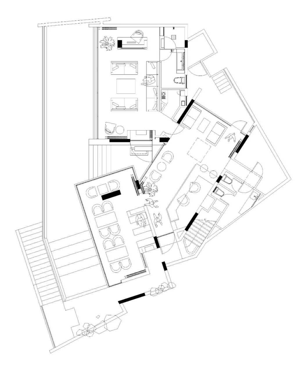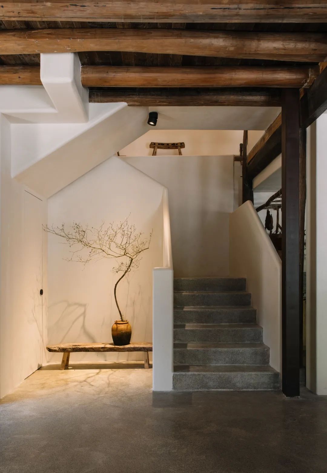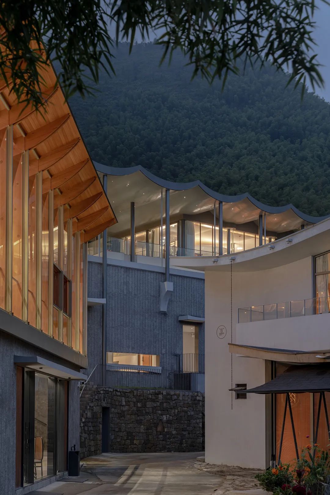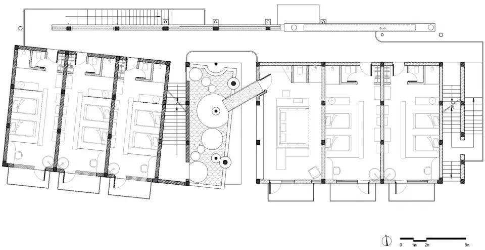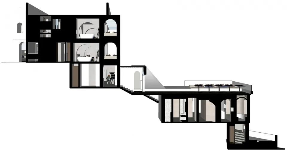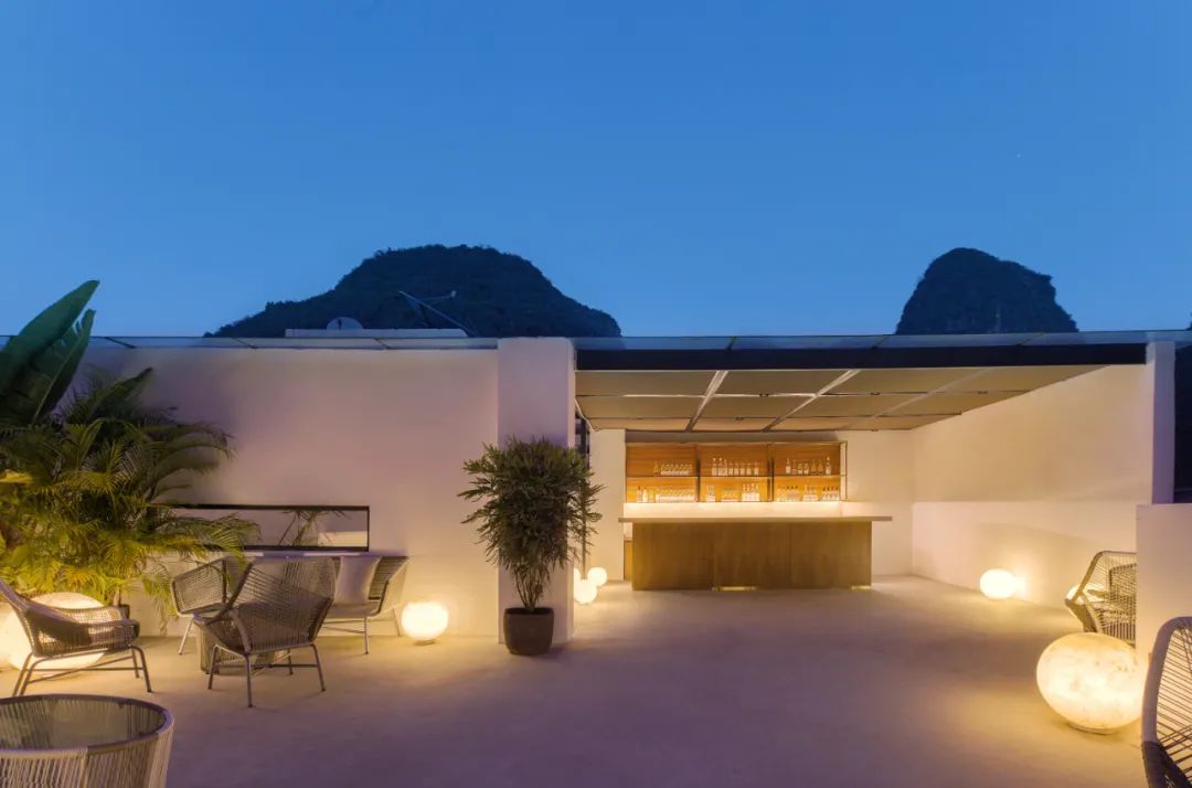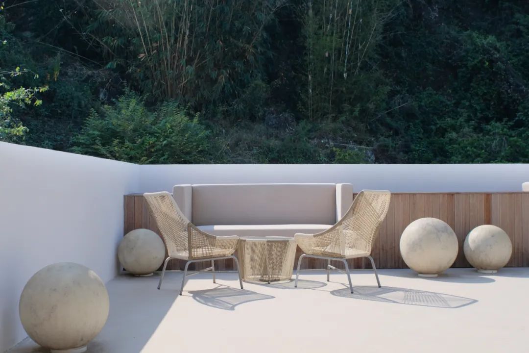 本案最大程度地保留了老建筑的石墙、木楼板和木屋架、灰瓦的坡屋顶,营造朴素原生的居住空间。同时,在一层入口插入白色体块,使原本分离的公共空间串联而具有纵深感;在大堂中央设置室外中庭,调节采光和气氛;通过框架结构,在三层架空多个白色体块,并对应景观使其方向做了扭转变化;三层以上形成屋顶平台,以满足无边泡池、露天剧场、聚会空间等配套功能。