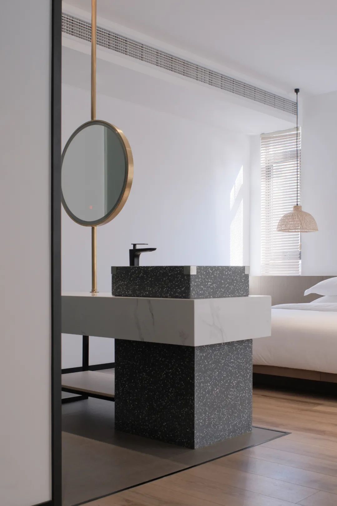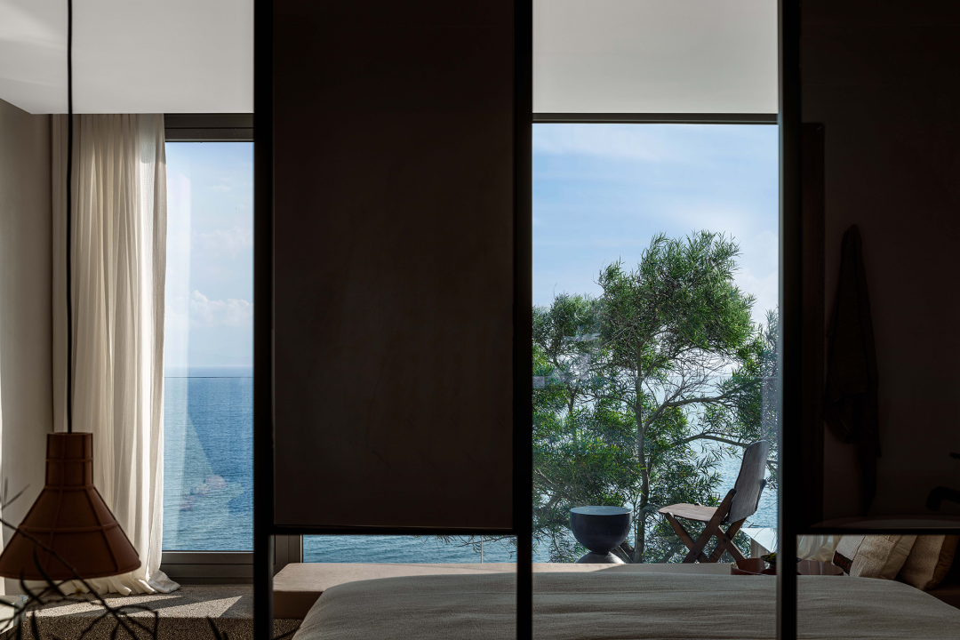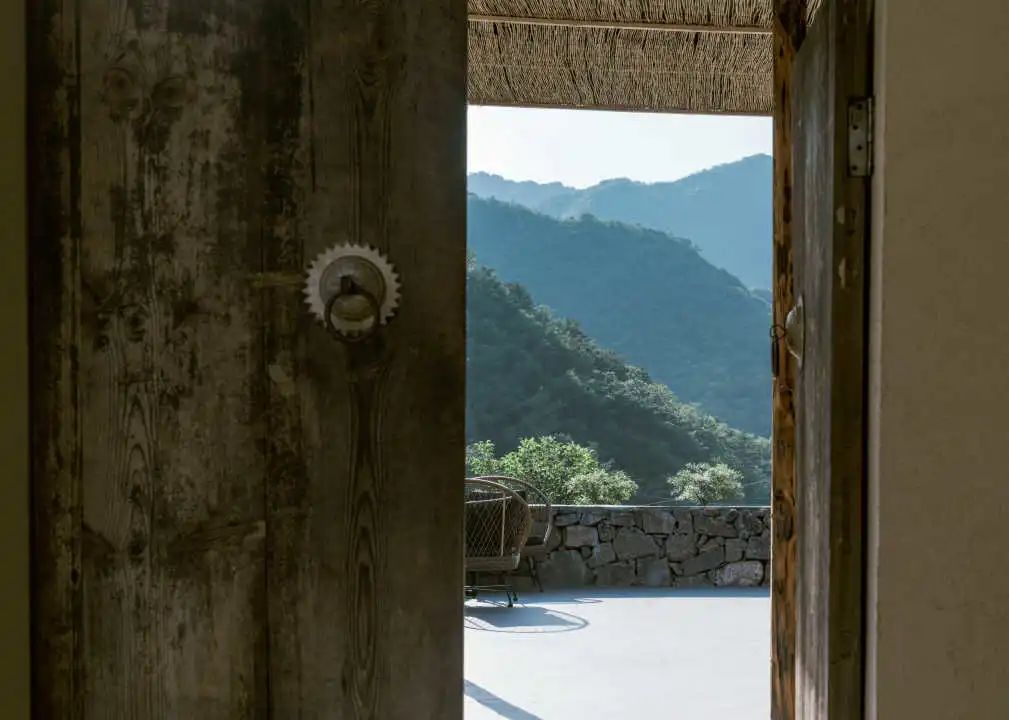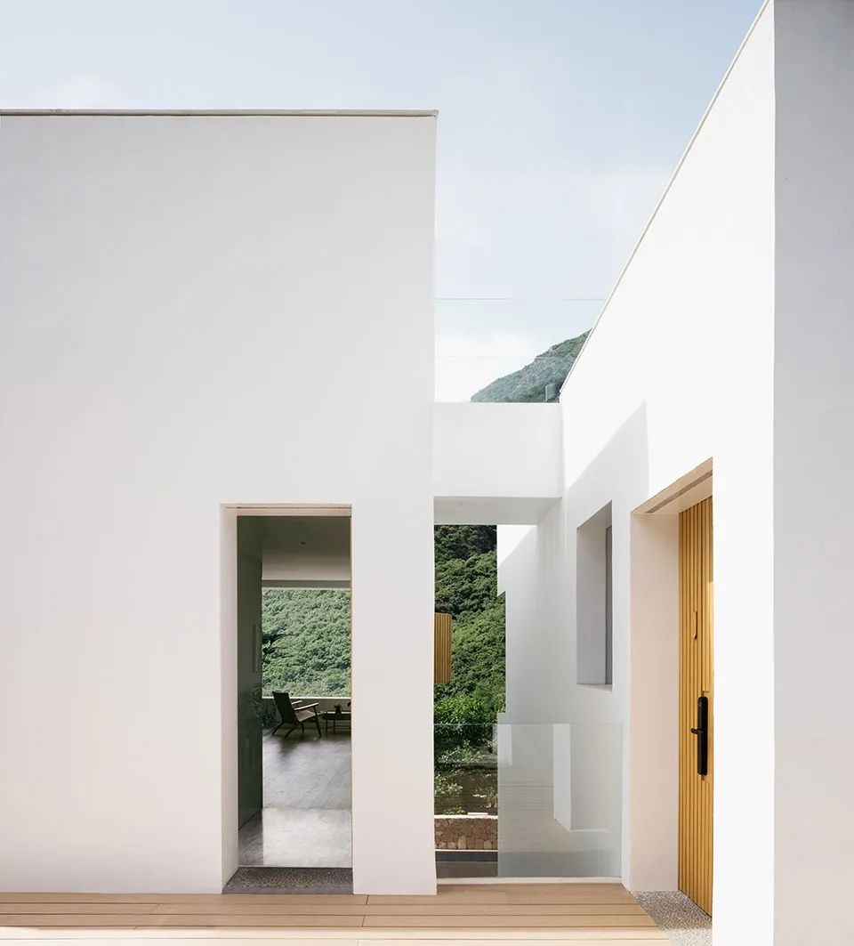 悬桥走廊与客房主体再次以短桥和天井的置入相分离,从而重新构造了入户体验的空间性认知。通过短桥,脚步再次90度转向,经过一缕撒入天井的阳光,客人步入玄关。正式进入室内场景后,空间维度再次被收缩,当经由起居、卧室,行至阳台,秦岭山脉的断面逐渐放大,横展眼前,那种人至于浩瀚自然中的状态再次重现,又以全然的心境回归对山川的照看。「空山九帖·秦岭」的空间序列所营造的从宏大到细微再到宏大的场域转换,给予人绝对而又有身体关照的秦岭体验。
