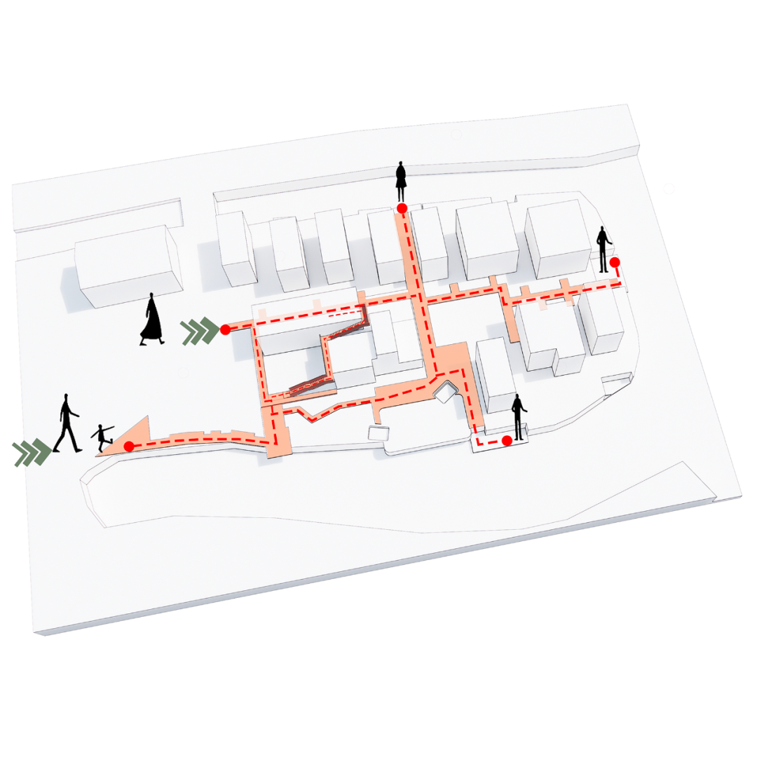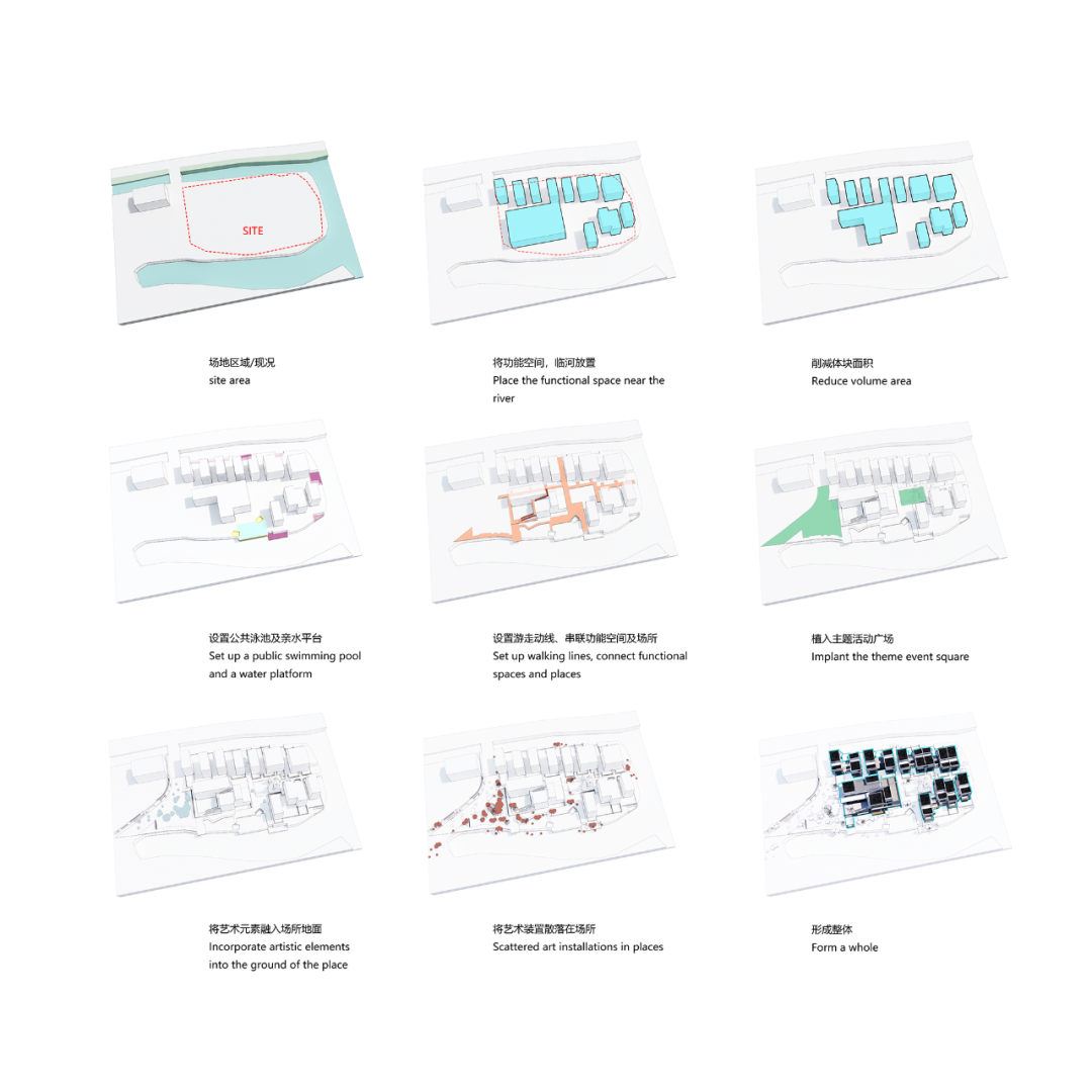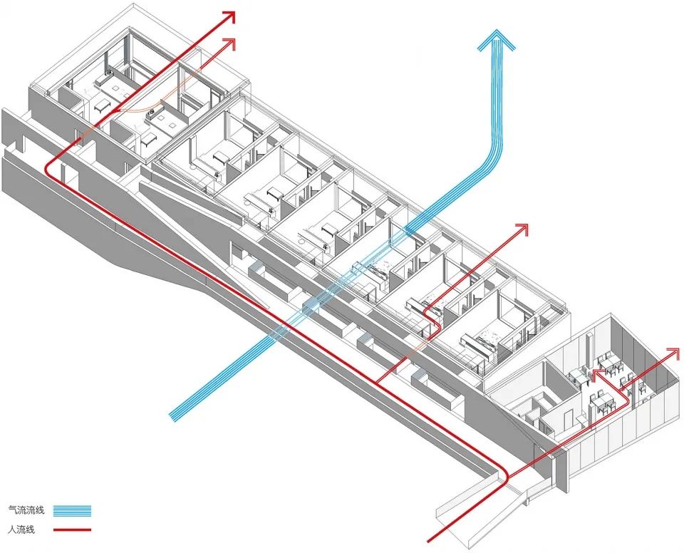 (1)“气流”指向空间流通,即建筑形体不打断场地的空气流、不打断场地空间的关联、也不打断场地空间与山脉自然基地的关联。